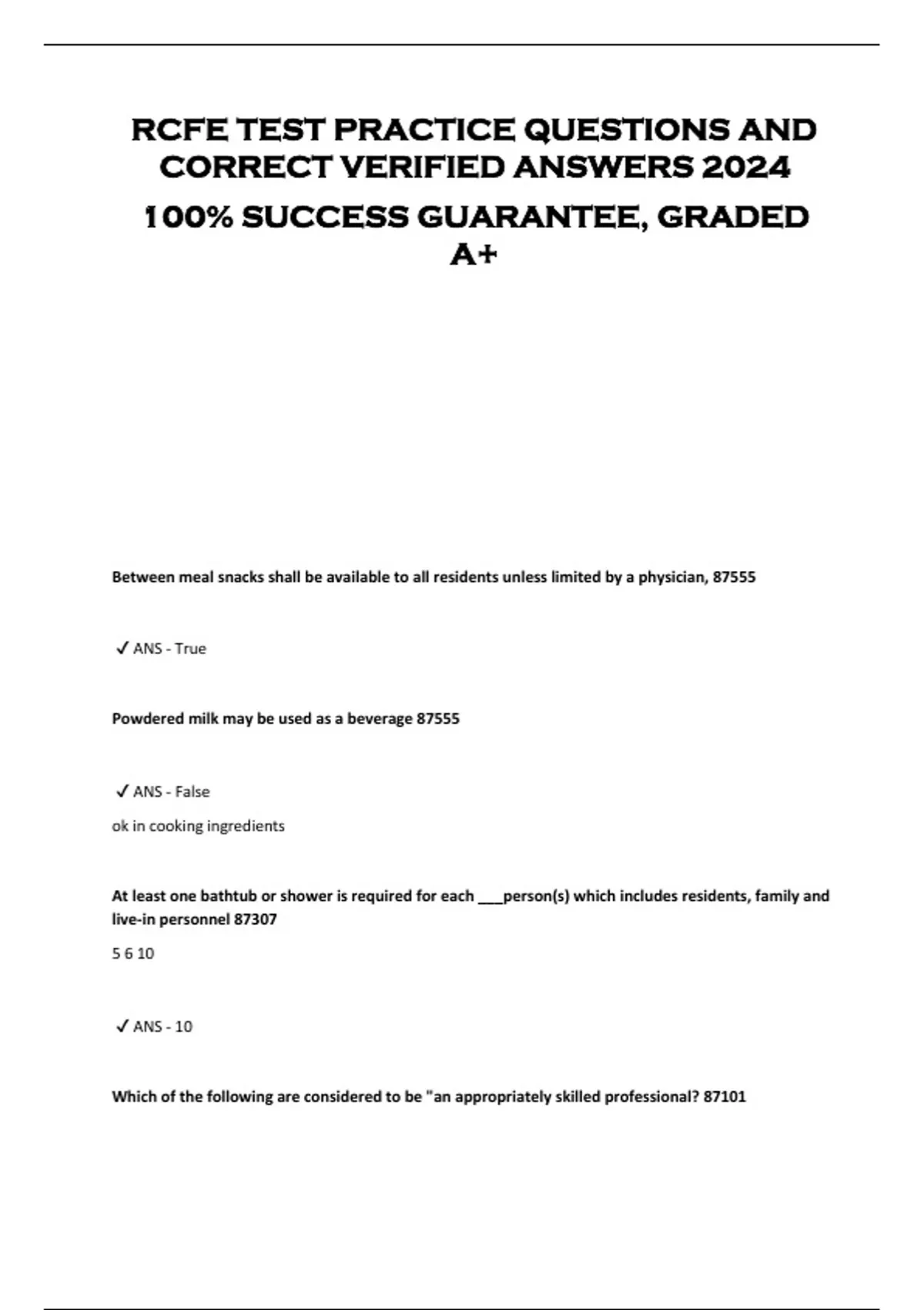 RCFE TEST PRACTICE QUESTIONS AND CORRECT VERIFIED ANSWERS 2024 100% SUCCESS GUARANTEE, GRADED A+