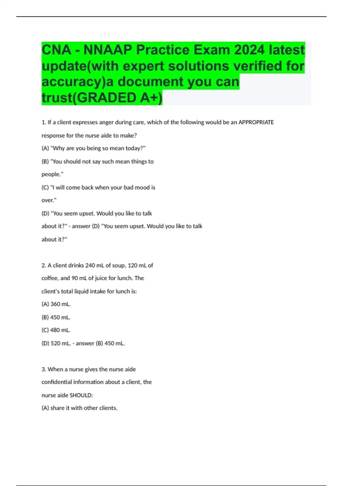 CNA - NNAAP Practice Exam 2024 latest update(with expert solutions verified for accuracy)a document you can trust(GRADED A+)