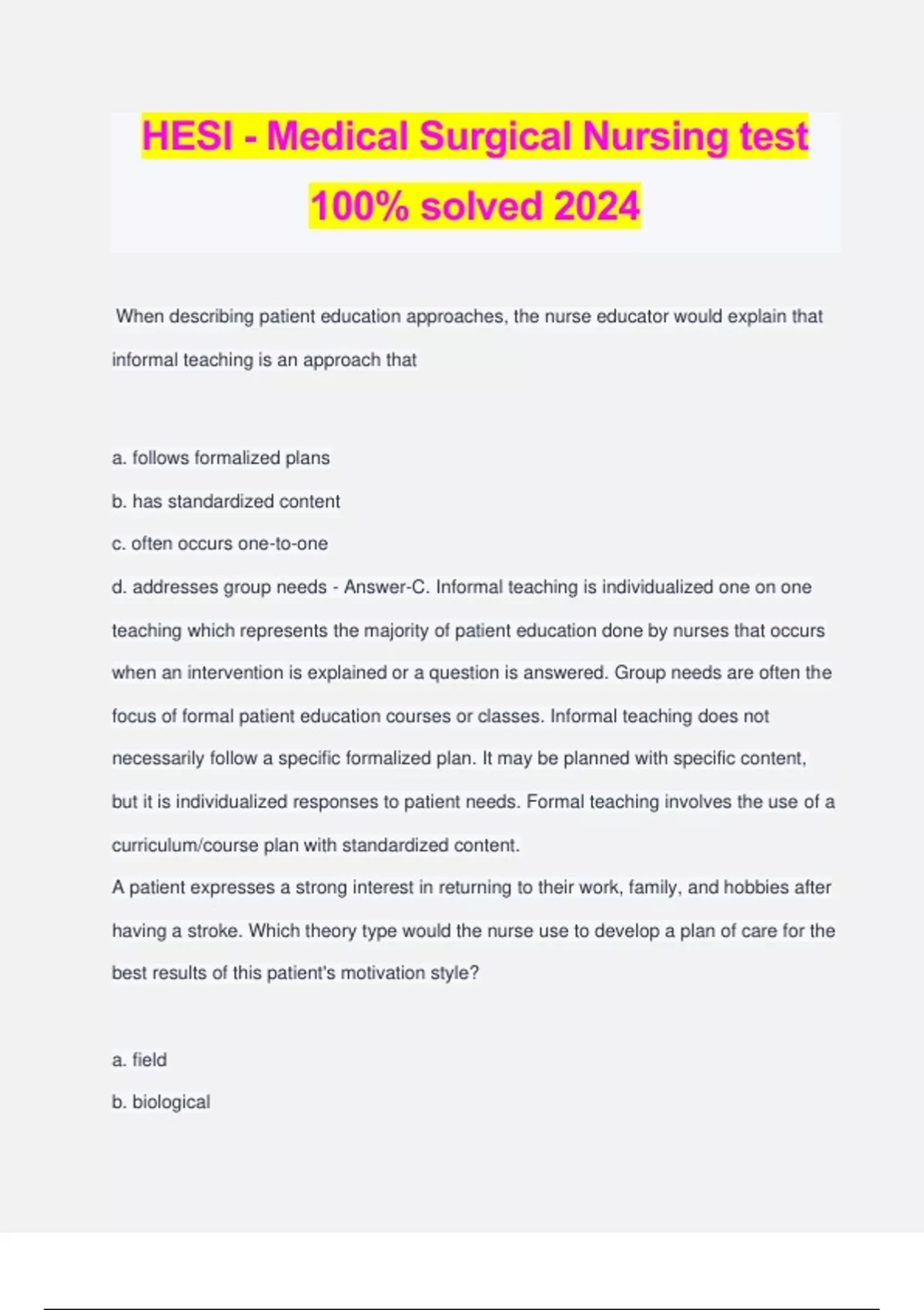 HESI - Medical Surgical Nursing test 100% solved 2024 When describing patient education approaches, the nurse educator would explain that informal teaching is an approach that a. follows formalized plans b. has standardized content c. often occurs one-to-one d. addresses group needs - Answer-C. Informal teaching is individualized one on one teaching which represents the majority of patient education done by nurses that occurs when an intervention is explained or a question is answered. Group needs are often the focus of formal patient education courses or classes. Informal teaching does not necessarily follow a specific formalized plan. It may be planned with specific content, but it is individualized responses to patient needs. Formal teaching involves the use of a curriculum/course plan with standardized content. A patient expresses a strong interest in returning to their work, family, and hobbies after having a stroke. Which theory type would the nurse use to develop a plan of care for the best results of this patient's motivation style? a. field b. biological c. cognitive d. sociologic - Answer-C. Cognitive theorists believe that attention, relevance, confidence, and satisfaction (ARCS) are the conditions that, when integrated, motivate someone to learn. Field theorists place significance on how achievement, power, the need for affiliation, and avoidance motives influence individual behavior. Sociologic theories are not involved in motivation. The nurse is assessing a group of clients. Which clients are at greater risk for hypothermia or frostbite? (select all that apply) a. an older woman with hypertension b. a young man with a body mass index of 42 c. a young many who has just consumed six martinis d. an older man who smokes a pack of cigarettes a day e. a young woman who is anorexic f. a young woman who is diabetic - Answer-C, D, E, F clients with poor nutrition, fatigue, and multiple chronic illnesses are at greater risk for hypothermia. Clients who smoke, consume alcohol, or have impaired peripheral circulation have a higher incidence of frostbite. Which statement made by a nurse represents the need for further education regarding pain management in older adult clients? a. older adults tend to report pain less often than younger adults b. older clients usually have more experience with pain than younger clients c. older adults are at greatest risk for under treated pain d. older clients have a different pain mechanism and do not feel it as much - Answer-D There is no evidence to support the idea that older adult clients perceive pain any differently than younger clients. The other statements are accurate regarding older clients and pain. The nurse is working at a first aid booth for a spring training game on a hot day. A spectator comes in, reporting that he is not feeling well. Vital signs are temp 104.1 F, pulse 132 BPM, respirs 26 breaths/min, and blood pressure 106/66 mm Hg. He trips over his feet as the nurse leads him to a cot. What is the priory action of the nurse? a. admin tylenol 650 mg orally b. encourage rest, and reassess in 15 minutes c. sponge the victim with cool water and remove his shirt d. encourage drinking of cool water or sports drink - Answer-C The spectator shows signs of heat stroke, which is a medical emergency. The spectator should be transported to the ED ASAP. The nurs should take actions to lower his body temp in teh meantime by removing his shirt and sponging his body with cool water. Lowering body temp by drinking cool fluids or taking acetaminophen is not as effective in an emergency situation. The client needs to be cooled quickly and is a priority for treatment