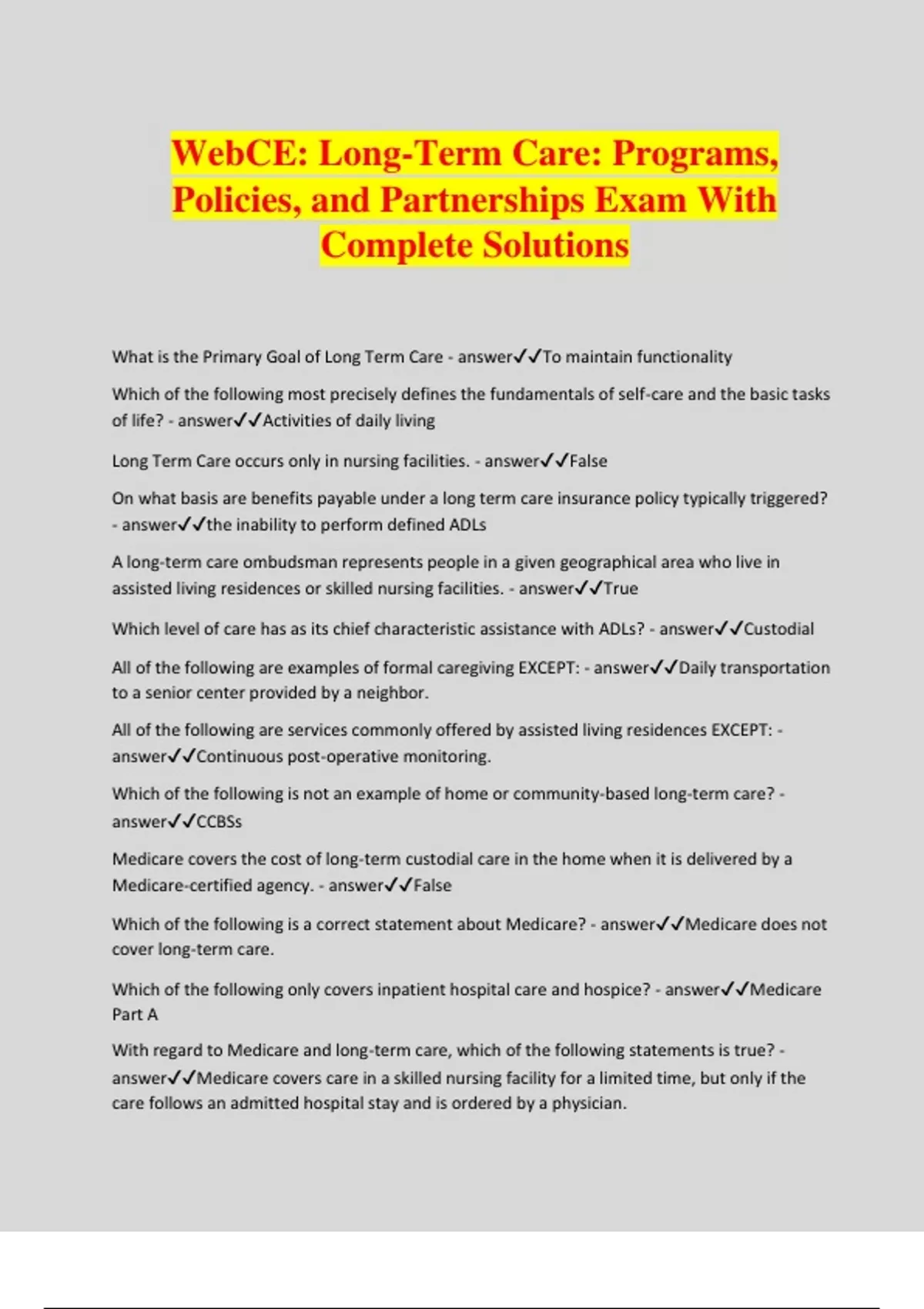 WebCE: Long-Term Care: Programs, Policies, and Partnerships Exam With Complete Solutions What is the Primary Goal of Long Term Care - answerTo maintain functionality Which of the following most precisely defines the fundamentals of self-care and the basic tasks of life? - answerActivities of daily living Long Term Care occurs only in nursing facilities. - answerFalse On what basis are benefits payable under a long term care insurance policy typically triggered? - answerthe inability to perform defined ADLs A long-term care ombudsman represents people in a given geographical area who live in assisted living residences or skilled nursing facilities. - answerTrue Which level of care has as its chief characteristic assistance with ADLs? - answerCustodial All of the following are examples of formal caregiving EXCEPT: - answerDaily transportation to a senior center provided by a neighbor. All of the following are services commonly offered by assisted living residences EXCEPT: - answerContinuous post-operative monitoring. Which of the following is not an example of home or community-based long-term care? - answerCCBSs Medicare covers the cost of long-term custodial care in the home when it is delivered by a Medicare-certified agency. - answerFalse Which of the following is a correct statement about Medicare? - answerMedicare does not cover long-term care.