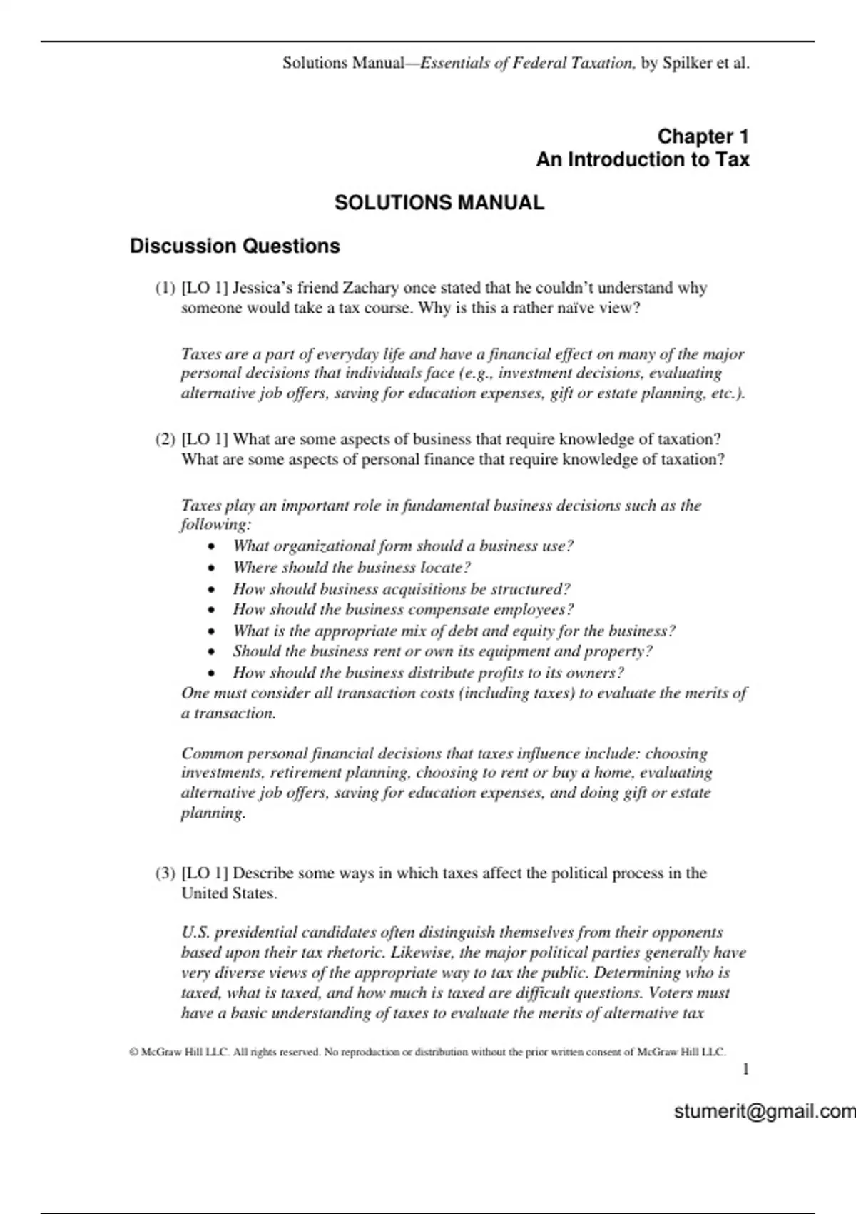 Solutions Manual—Essentials of Federal Taxation, by Spilker et al. © McGraw Hill LLC. All rights reserved. No reproduction or distribution without the prior written consent of McGraw Hill LLC. 1 Chapter 1 An Introduction to Tax SOLUTIONS MANUAL Discussion Questions (1) [LO 1] Jessica’s friend Zachary once stated that he couldn’t understand why someone would take a tax course. Why is this a rather naïve view? Taxes are a part of everyday life and have a financial effect on many of the major personal decisions that individuals face (e.g., investment decisions, evaluating alternative job offers, saving for education expenses, gift or estate planning, etc.). (2) [LO 1] What are some aspects of business that require knowledge of taxation? What are some aspects of personal finance that require knowledge of taxation? Taxes play an important role in fundamental business decisions such as the following: • What organizational form should a business use? • Where should the business locate? • How should business acquisitions be structured? • How should the business compensate employees? • What is the appropriate mix of debt and equity for the business? • Should the business rent or own its equipment and property? • How should the business distribute profits to its owners? One must consider all transaction costs (including taxes) to evaluate the merits of a transaction. Common personal financial decisions that taxes influence include: choosing investments, retirement planning, choosing to rent or buy a home, evaluating alternative job offers, saving for education expenses, and doing gift or estate planning. (3) [LO 1] Describe some ways in which taxes affect the political process in the United States. U.S. presidential candidates often distinguish themselves from their opponents based upon their tax rhetoric. Likewise, the major political parties generally have very diverse views of the appropriate way to tax the public. Determining who is taxed, what is taxed, and how much is taxed are difficult questions. Voters must have a basic understanding of taxes to evaluate the merits of alternative tax Solutions Manual—Essentials of Federal Taxation, by Spilker et al. © McGraw Hill LLC. All rights reserved. No reproduction or distribution without the prior written consent of McGraw Hill LLC. 2 proposals offered by opposing political candidates and their political parties. (4) [LO 2] Courtney recently received a speeding ticket on her way to the university. Her fine was $200. Is this considered a tax? Why or why not? The $200 speeding ticket is not considered a tax. Instead, it is considered a fine or penalty. Taxes differ from fines and penalties because taxes are not intended to punish or prevent illegal behavior. (5) [LO 2] Marlon and Latoya recently started building a house. They had to pay $300 to the county government for a building permit. Is the $300 payment a tax? Why or why not? The building permit is not considered a tax because $300 payment is directly linked to a benefit that they received (i.e., the ability to build a house). (6) [LO 2] To help pay for the city’s new stadium, the city of Birmingham recently enacted a 1 percent surcharge on hotel rooms. Is this a tax? Why or why not? The 1 percent surcharge is a tax. The 1 percent surcharge is an earmarked tax – i.e., collected for a specific purpose. The surcharge is considered a tax because the tax payments made by taxpayers do not directly relate to the specific benefit received by the taxpayers. (7) [LO 2] As noted in Example 1-2, tolls, parking meter fees, and annual licensing fees are not considered taxes. Can you identify other fees that are similar? There are several possible answers to this question. Some common examples include entrance fees to national parks, tag fees paid to local/state government for automobiles, boats, etc. (8) [LO 2] If the general objective of our tax system is to raise revenue, why does the income tax allow deductions for charitable contributions and retirement plan contributions? In addition to the general objective of raising revenue, Congress uses the federal tax system to encourage certain behavior and discourage other behavior. The charitable contribution deduction is intended to encourage taxpayers to support the initiatives of charitable organizations, whereas deductions for retirement contributions are intended to encourage retirement savings. Another objective of the tax system is to redistribute wealth. (9) [LO 2] One common argument for imposing so-called sin taxes is the social goal of reducing demand for such products. Using cigarettes as an example, is there a Solutions Manual—Essentials of Federal Taxation, by Spilker et al. © McGraw Hill LLC. All rights reserved. No reproduction or distribution without the prior written consent of McGraw Hill LLC. 3 segment of the population that might be sensitive to price and for whom high taxes might discourage purchases? The most obvious segment sensitive to price may be teenagers and younger adults that typically have less disposable income, although price sensitivity or elasticity will vary by taxpayer. (10) [LO 3] Dontae stated that he didn’t want to earn any more money because it would “put him in a higher tax bracket.” What is wrong with Dontae’s reasoning? Although earning additional taxable income may increase Dontae’s marginal tax rate (i.e., put him in a higher tax bracket), the additional income earned does not affect the taxes that Dontae will pay on his existing income. Moving to a higher tax bracket simply means that Dontae will pay a higher tax rate on the additional income earned (not on the income that he already has). (11) [LO 3] Describe the three different tax rates discussed in the chapter and how taxpayers might use them. The marginal tax rate is the tax rate that applies to the taxpayer’s additional taxable income or deductions that the taxpayer is evaluating in a decision. Specifically, Δ ( )