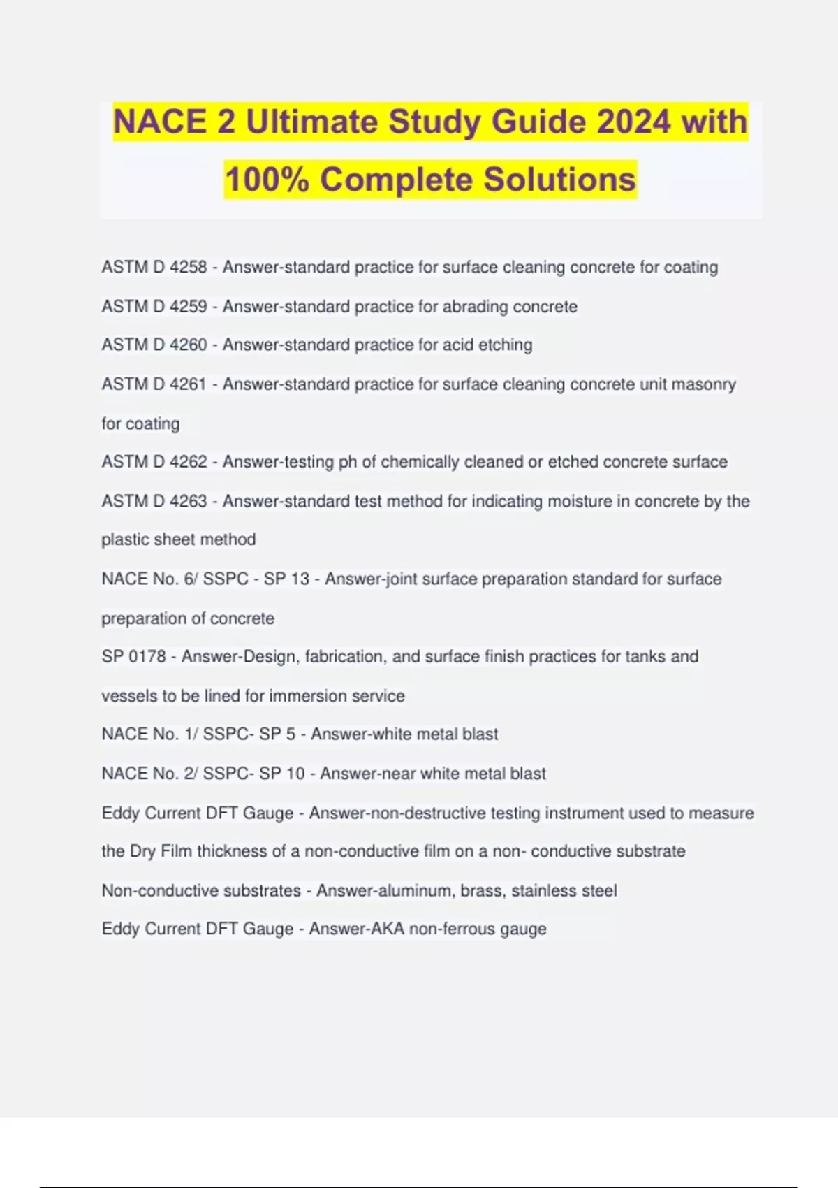 NACE 2 Ultimate Study Guide 2024 with 100% Complete Solutions ASTM D 4258 - Answer-standard practice for surface cleaning concrete for coating ASTM D 4259 - Answer-standard practice for abrading concrete ASTM D 4260 - Answer-standard practice for acid etching ASTM D 4261 - Answer-standard practice for surface cleaning concrete unit masonry for coating ASTM D 4262 - Answer-testing ph of chemically cleaned or etched concrete surface ASTM D 4263 - Answer-standard test method for indicating moisture in concrete by the plastic sheet method NACE No. 6/ SSPC - SP 13 - Answer-joint surface preparation standard for surface preparation of concrete SP 0178 - Answer-Design, fabrication, and surface finish practices for tanks and vessels to be lined for immersion service NACE No. 1/ SSPC- SP 5 - Answer-white metal blast NACE No. 2/ SSPC- SP 10 - Answer-near white metal blast Eddy Current DFT Gauge - Answer-non-destructive testing instrument used to measure the Dry Film thickness of a non-conductive film on a non- conductive substrate Non-conductive substrates - Answer-aluminum, brass, stainless steel Eddy Current DFT Gauge - Answer-AKA non-ferrous gauge UT Gauge - Answer-non-destructive testing instrument uses pulse Echo to measure coating thickness on a non-metal substrate Non-metal Substrates - Answer-plastic, wood, concrete, wall board ASTM D 6132 - Answer-standard for measuring coating thickness on substrate by ultrasonic thickness gauge NACE standards - Answer-voluntary standards using consensus procedures localized corrosion - Answer-more frequently causes the need for unplanned maintenance 40% relative humidity - Answer-corrosion virtually ceases Anode - Answer-negative posts Anode - Answer-the less noble region also where reduction occurs Cathode - Answer-the more noble region Cathode - Answer-positive post