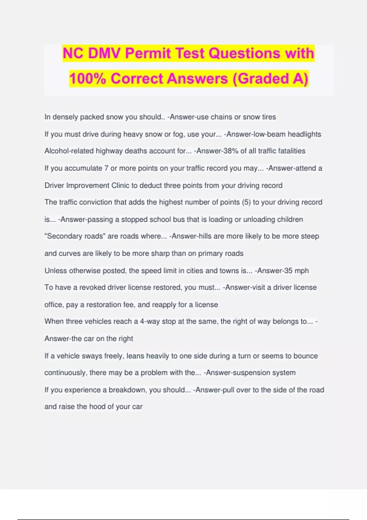 NC DMV Permit Test Questions with 100% Correct Answers (Graded A) In densely packed snow you should.. -Answer-use chains or snow tires If you must drive during heavy snow or fog, use your... -Answer-low-beam headlights Alcohol-related highway deaths account for... -Answer-38% of all traffic fatalities If you accumulate 7 or more points on your traffic record you may... -Answer-attend a Driver Improvement Clinic to deduct three points from your driving record The traffic conviction that adds the highest number of points (5) to your driving record is... -Answer-passing a stopped school bus that is loading or unloading children "Secondary roads" are roads where... -Answer-hills are more likely to be more steep and curves are likely to be more sharp than on primary roads Unless otherwise posted, the speed limit in cities and towns is... -Answer-35 mph To have a revoked driver license restored, you must... -Answer-visit a driver license office, pay a restoration fee, and reapply for a license When three vehicles reach a 4-way stop at the same, the right of way belongs to... - Answer-the car on the right If a vehicle sways freely, leans heavily to one side during a turn or seems to bounce continuously, there may be a problem with the... -Answer-suspension system If you experience a breakdown, you should... -Answer-pull over to the side of the road and raise the hood of your car