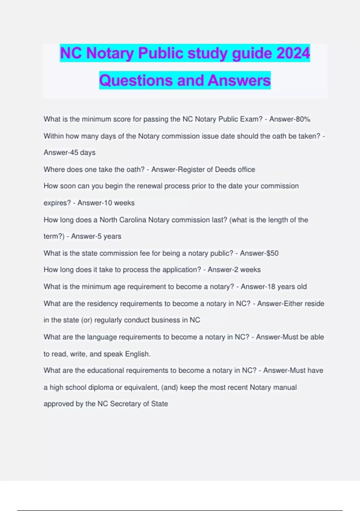 NC Notary Public study guide 2024 Questions and Answers What is the minimum score for passing the NC Notary Public Exam? - Answer-80% Within how many days of the Notary commission issue date should the oath be taken? - Answer-45 days Where does one take the oath? - Answer-Register of Deeds office How soon can you begin the renewal process prior to the date your commission expires? - Answer-10 weeks How long does a North Carolina Notary commission last? (what is the length of the term?) - Answer-5 years What is the state commission fee for being a notary public? - Answer-$50 How long does it take to process the application? - Answer-2 weeks What is the minimum age requirement to become a notary? - Answer-18 years old What are the residency requirements to become a notary in NC? - Answer-Either reside in the state (or) regularly conduct business in NC What are the language requirements to become a notary in NC? - Answer-Must be able to read, write, and speak English. What are the educational requirements to become a notary in NC? - Answer-Must have a high school diploma or equivalent, (and) keep the most recent Notary manual approved by the NC Secretary of State