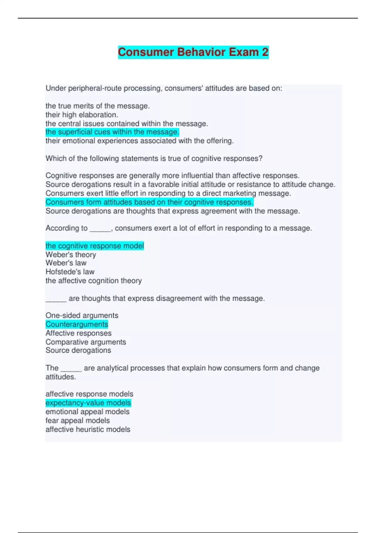 Consumer Behavior Exam 2 - Questions with Verified Answers Under peripheral-route processing, consumers' attitudes are based on: the true merits of the message. their high elaboration. the central issues contained within the message. the superficial cues within the message. their emotional experiences associated with the offering. Which of the following statements is true of cognitive responses? Cognitive responses are generally more influential than affective responses. Source derogations result in a favorable initial attitude or resistance to attitude change. Consumers exert little effort in responding to a direct marketing message. Consumers form attitudes based on their cognitive responses. Source derogations are thoughts that express agreement with the message. According to _____, consumers exert a lot of effort in responding to a message. the cognitive response model Weber's theory Weber's law Hofstede's law the affective cognition theory _____ are thoughts that express disagreement with the message. One-sided arguments Counterarguments Affective responses Comparative arguments Source derogations The _____ are analytical processes that explain how consumers form and change attitudes. affective response models expectancy-value models emotional appeal models fear appeal models affective heuristic models Expectancy-value models are analytical processes that explain: the different levels of abstractness in the associations that a consumer has about concepts. the beliefs or knowledge consumers have about an object or action. how fear or anxiety are elicited by stressing negative consequences. how losses loom larger than gains for consumers even when the two outcomes are of the same magnitude. how consumers' cultures can vary along four main value dimensions. _____ is the model that provides an explanation of how, when, and why attitudes predict consumer behavior. Weber's law The body feedback theory Hofstede's law The prospect theory The theory of reasoned action Which of the following statements is true of source credibility? Credible sources convince even those consumers who hold their existing attitude with confidence. Consumers are more likely to believe that a source is credible when the source endorses multiple products. Consumers tend to believe official sources are more credible than ordinary people. The sleeper effect does not occur when a message is delivered by a low-credibility source. Sources are credible when they are trustworthy, have expertise, and have high status. _____ occurs when consumers forget the source of a message more quickly than they forget the message. Attitude confidence Symbolic motivation Emotional contagion The sleeper effect The endowment effect Which of the following statements is true of strong arguments in a message? Consumers are persuaded by a message containing a strong argument when they devote sufficient cognitive resources to processing the information. Combining a strong argument with an implicit conclusion in an ad message engenders less favorable brand attitudes among consumers with a high need for cognition. Strong arguments have a greater effect on behavioral intentions when consumers focus on the outcome of using a product rather than on the process of using it. Strong arguments concentrate on presenting a negative and limited viewpoint through the message. Strong arguments have a negative effect on behavioral intentions, especially for low-to moderate-involvement products. A two-sided message is one that: contains both positive and negative information. contains information from two different sources. has both hedonic and utilitarian aspects. uses two types of comparative advertising. opens up communication between two sources. Which of the following statements is true of comparative messages? Negatively framed comparative messages are more effective for promotion-focused consumers than positively framed comparative messages. Comparative messages are useful in changing a consumer's negative first impression of a brand or company. The most common type of comparative messages is the direct comparative message. Comparative messages show how much better the offering is than a competitor's offering. When motivation, ability, and opportunity is high, consumers are more likely to confuse the advertised brand with its competition. An indirect comparative message is: one in which the offering is compared with those of unnamed competitors. a message delivered by a low-credibility source. a thought that discounts or attacks the message source. a message that is forgotten more quickly than the source. one in which a company's new product is compared to its original product. With direct comparative advertising, advertisers: explicitly name a competitor or set of competitors and attack them on the basis of an attribute or benefit. present two-sided messages about their offerings. show an offering that has features similar to that of a competitor's offering. explicitly discount or attack the competitor's message source. use the disrupt-then-reframe technique to disrupt consumers' cognitive processing of the communication. Which of the following statements is true of direct comparative messages?