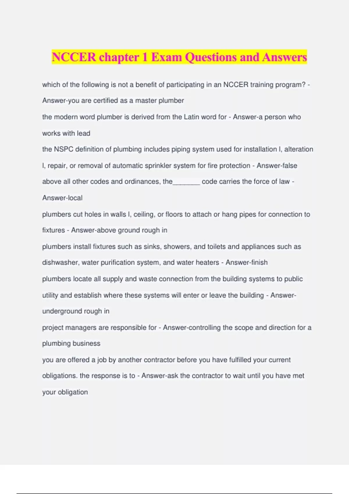 NCCER chapter 1 Exam Questions and Answers which of the following is not a benefit of participating in an NCCER training program? - Answer-you are certified as a master plumber the modern word plumber is derived from the Latin word for - Answer-a person who works with lead the NSPC definition of plumbing includes piping system used for installation l, alteration l, repair, or removal of automatic sprinkler system for fire protection - Answer-false above all other codes and ordinances, the_______ code carries the force of law - Answer-local plumbers cut holes in walls l, ceiling, or floors to attach or hang pipes for connection to fixtures - Answer-above ground rough in plumbers install fixtures such as sinks, showers, and toilets and appliances such as dishwasher, water purification system, and water heaters - Answer-finish plumbers locate all supply and waste connection from the building systems to public utility and establish where these systems will enter or leave the building - Answer- underground rough in