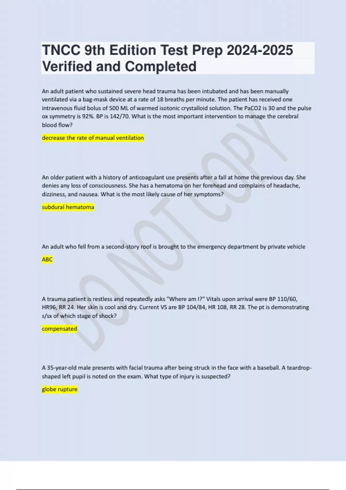 An adult patient who sustained severe head trauma has been intubated and has been manually ventilated via a bag-mask device at a rate of 18 breaths per minute. The patient has received one intravenous fluid bolus of 500 ML of warmed isotonic crystalloid solution. The PaCO2 is 30 and the pulse ox symmetry is 92%. BP is 142/70. What is the most important intervention to manage the cerebral blood flow? decrease the rate of manual ventilation An older patient with a history of anticoagulant use presents after a fall at home the previous day. She denies any loss of consciousness. She has a hematoma on her forehead and complains of headache, dizziness, and nausea. What is the most likely cause of her symptoms? subdural hematoma An adult who fell from a second-story roof is brought to the emergency department by private vehicle ABC A trauma patient is restless and repeatedly asks "Where am I?" Vitals upon arrival were BP 110/60, HR96, RR 24. Her skin is cool and dry. Current VS are BP 104/84, HR 108, RR 28. The pt is demonstrating s/sx of which stage of shock? compensated A 35-year-old male presents with facial trauma after being struck in the face with a baseball. A teardropshaped left pupil is noted on the exam. What type of injury is suspected? globe ruptur