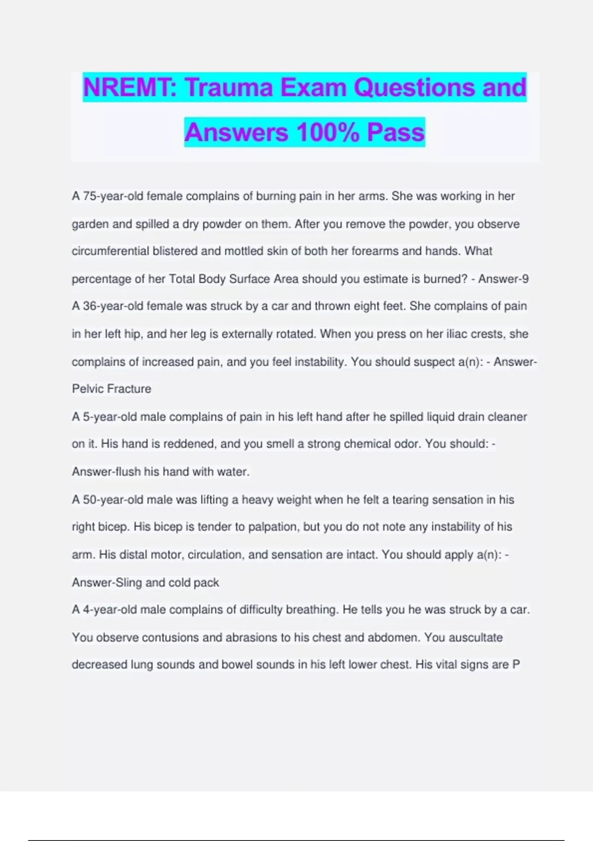 NREMT: Trauma Exam Questions and Answers 100% Pass A 75-year-old female complains of burning pain in her arms. She was working in her garden and spilled a dry powder on them. After you remove the powder, you observe circumferential blistered and mottled skin of both her forearms and hands. What percentage of her Total Body Surface Area should you estimate is burned? - Answer-9 A 36-year-old female was struck by a car and thrown eight feet. She complains of pain in her left hip, and her leg is externally rotated. When you press on her iliac crests, she complains of increased pain, and you feel instability. You should suspect a(n): - Answer- Pelvic Fracture A 5-year-old male complains of pain in his left hand after he spilled liquid drain cleaner on it. His hand is reddened, and you smell a strong chemical odor. You should: - Answer-flush his hand with water. A 50-year-old male was lifting a heavy weight when he felt a tearing sensation in his right bicep. His bicep is tender to palpation, but you do not note any instability of his arm. His distal motor, circulation, and sensation are intact. You should apply a(n): - Answer-Sling and cold pack A 4-year-old male complains of difficulty breathing. He tells you he was struck by a car. You observe contusions and abrasions to his chest and abdomen. You auscultate decreased lung sounds and bowel sounds in his left lower chest. His vital signs are P 112, R 40, BP 100/74, and SpO2 is 92% on room air. You should: - Answer-administer oxygen A 77-year-old female complains of pain in her left upper arm. She tells you she tripped on a rug and fell. Her left proximal humerus is unstable, she can move her fingers, feel your touch, and the radial pulse is present. You should apply a(n): - Answer-sling and swathe A 68-year-old male complains of pain after he slammed his right second phalange in a door. You observe bleeding and angulation of the distal tip. He has a capillary refill of two seconds. You should apply a sterile dressing and: - Answer-tape his 2nd and 3rd phalanges together An 85-year-old male complains of severe pain in his right thigh after he was struck above his knee with a metal pole. He complains of weakness in his leg, and you observe bruising where he was struck. You do not palpate any instability or deformity. You should: - Answer-apply a padded board splint An unresponsive 20-year-old male was shot in the left upper abdominal quadrant. His skin is pale and diaphoretic. His airway is open, and his lungs are clear to auscultation. You palpate a pulsating mass midline between his xiphoid process and umbilicus. You should immediately: - Answer-transport him A disoriented 19-year-old male was struck in the right temple with a golf club. You observe an expanding hematoma to the area and clear fluid draining from his ear. His vital signs are P 64, R 14, BP 192/102, and SpO2 is 94% on room air. You should: - Answer-apply a cervical collar A 21-year-old female tells you she was stabbed by a piece of metal in her abdomen 15 minutes ago. When you examine the area, you observe minimal bleeding and pink sausage-like tissue protruding from the opening in her left lower abdominal quadrant. You should suspect a(n): - Answer-evisceration A 24-year-old female complains of chest pain and difficulty breathing. She tells you a horse kicked her in the chest. Her skin is pale and diaphoretic. You observe a contusion to the left side of her anterior chest wall. Breath sounds are absent over her left lower lung. Her vital signs are P 116, R 22, BP 92/80, and SpO2 is 95% on room air. You should suspect: - Answer-hemothorax A 43-year-old female tells you that she was sexually assaulted. She complains of pain in her chest and groin from being kicked. You do not see any signs of bleeding through her outer clothing. You should listen to her lung sounds and: - Answer-ask her if she is bleeding An 88-year-old male spilled muriatic acid on himself while cleaning metal. He complains of pain to his chest and abdomen. You observ