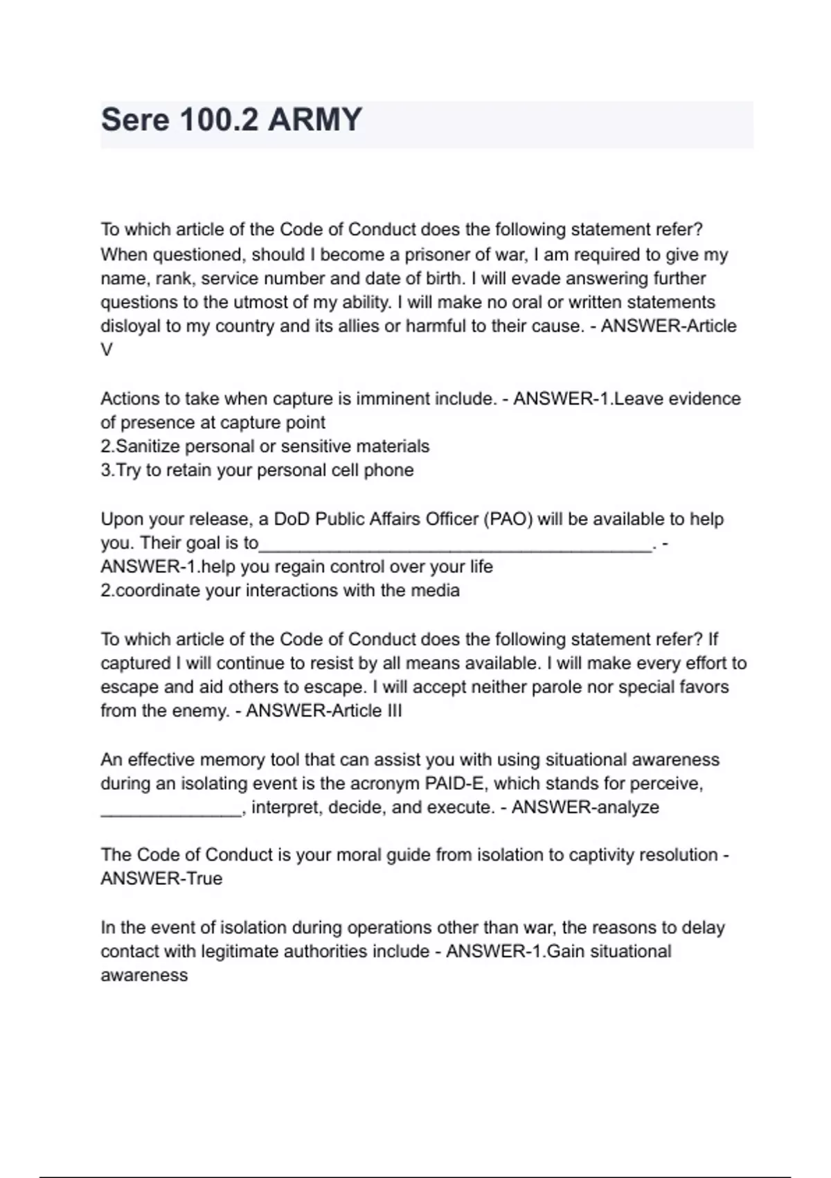 Sere 100.2 ARMYTo which article of the Code of Conduct does the following statement refer? When questioned, should I become a prisoner of war, I am required to give my name, rank, service number and date of birth. I will evade answering further questions to the utmost of my ability. I will make no oral or written statements disloyal to my country and its allies or harmful to their cause. - ANSWER-Article V Actions to take when capture is imminent include. - ANSWER-1.Leave evidence of presence at capture point 2.Sanitize personal or sensitive materials 3.Try to retain your personal cell phone Upon your release, a DoD Public Affairs Officer (PAO) will be available to help you. Their goal is to_______________________________________. - ANSWER- you regain control over your life inate your interactions with the media To which article of the Code of Conduct does the following statement refer? If captured I will continue to resist by all means available. I will make every effort to escape and aid others to escape. I will accept neither parole nor special favors from the enemy. - ANSWER-Article III An effective memory tool that can assist you with using situational awareness during an isolating event is the acronym PAID-E, which stands for perceive, ______________, interpret, decide, and execute. - ANSWER-analyze The Code of Conduct is your moral guide from isolation to captivity resolution - ANSWER-True In the event of isolation during operations other than war, the reasons to delay contact with legitimate au