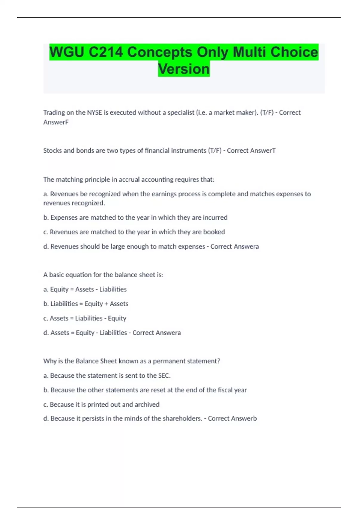 WGU C214 Concepts Only Multi Choice Version Trading on the NYSE is executed without a specialist (i.e. a market maker). (T/F) - Correct AnswerF Stocks and bonds are two types of financial instruments (T/F) - Correct AnswerT The matching principle in accrual accounting requires that: a. Revenues be recognized when the earnings process is complete and matches expenses to revenues recognized. b. Expenses are matched to the year in which they are incurred c. Revenues are matched to the year in which they are booked d. Revenues should be large enough to match expenses - Correct Answera