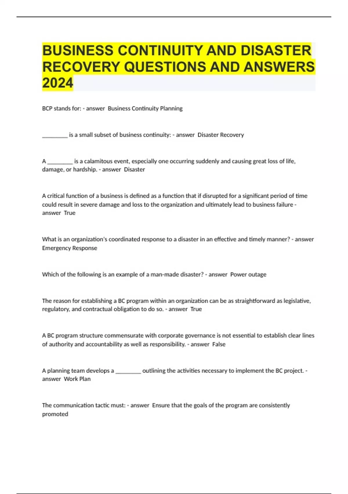 Business Continuity And Disaster Recovery questions and answers 2024