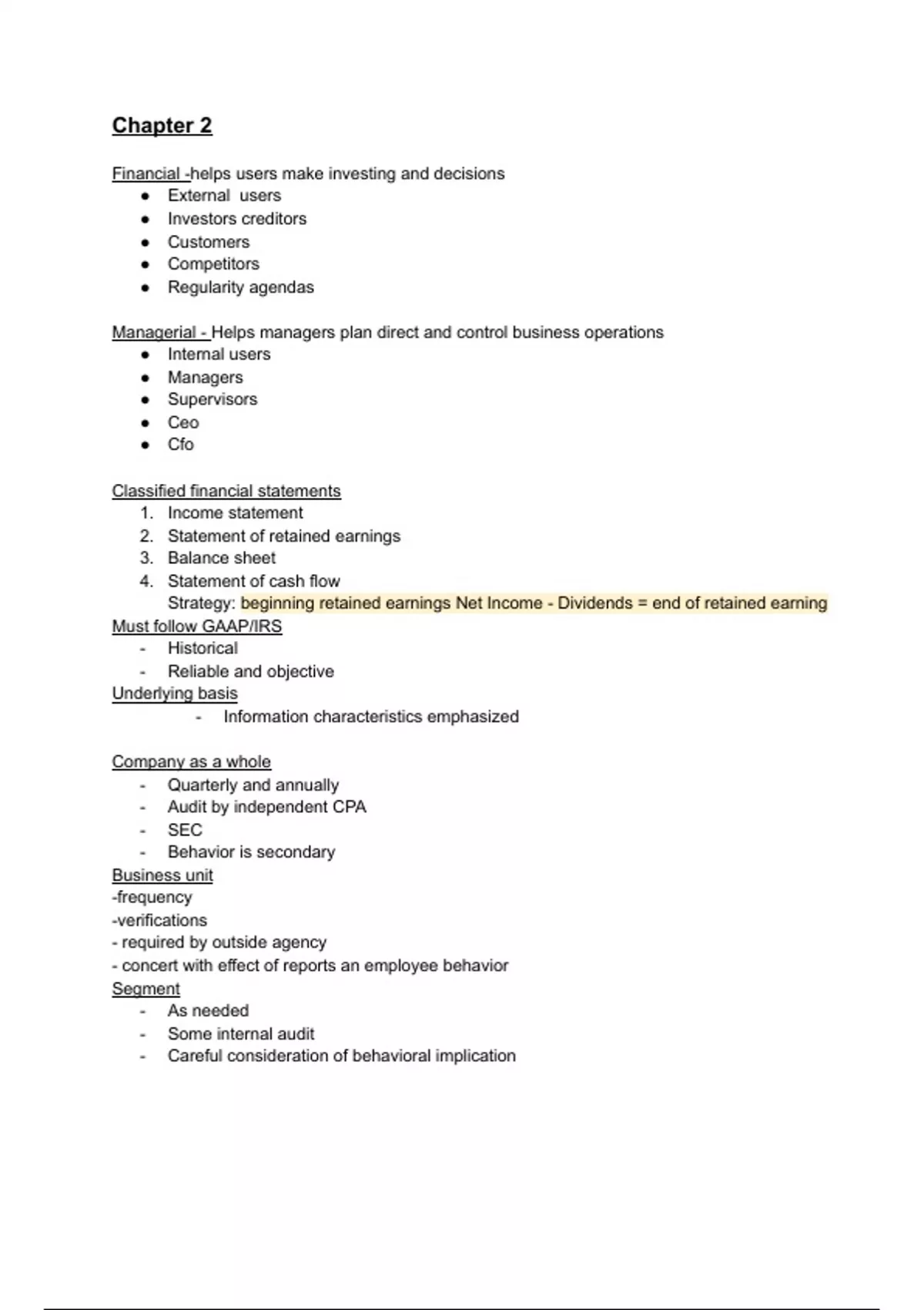 Financial reporting supports users in making investment and financial decisions, serving external stakeholders like investors, creditors, customers, competitors, and regulatory bodies. It encompasses various classified financial statements such as the income statement, statement of retained earnings, balance sheet, and statement of cash flows. The strategy involves calculating end-of-period retained earnings by subtracting dividends from the sum of beginning retained earnings and net income, in compliance with GAAP/IRS regulations. It prioritizes historical data, reliability, objectivity, and an underlying basis, emphasizing specific information characteristics. On the other hand, managerial reporting aids managers in planning, directing, and controlling business operations, targeting internal users like managers, supervisors, CEOs, and CFOs. It involves the preparation of financial statements and requires careful consideration of behavioral implications, frequency, verifications, and compliance with external agencies. While external reporting focuses more on regulatory compliance, internal reporting emphasizes business unit performance and behavioral implications. It also involves segment reporting, internal audits, and aligning reports with employee behavior.