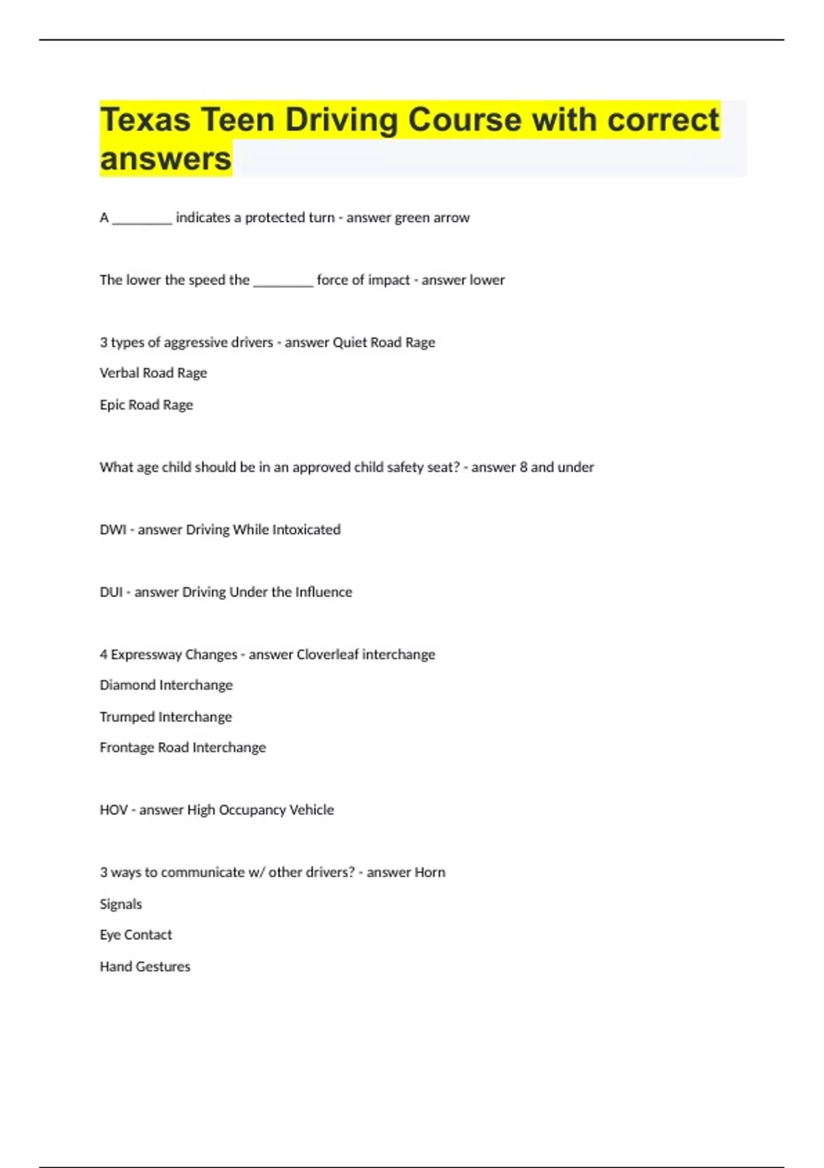 Texas Teen Driving Course with correct answers.