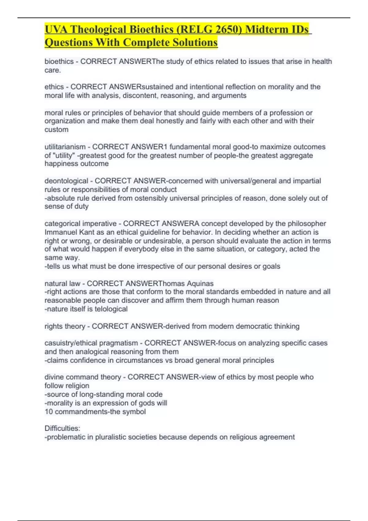 UVA Theological Bioethics (RELG 2650) Midterm IDs Questions With Complete Solutions UVA Theological Bioethics (RELG 2650) Midterm IDs Questions With Complete Solutions