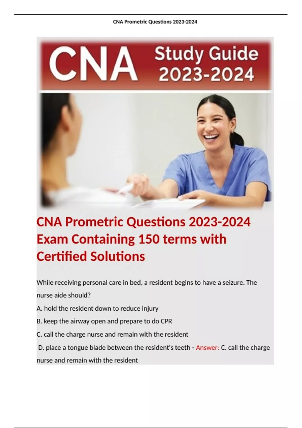 CNA Prometric Questions Exam Containing 150 terms with Certified Solutions . Terms like: While receiving personal care in bed, a resident begins to have a seizure. The nurse aide should? A. hold the resident down to reduce injury B. keep the airway open and prepare to do CPR C. call the charge nurse and remain with the resident D. place a tongue blade between the resident's teeth - Answer: C. call the charge nurse and remain with the resident