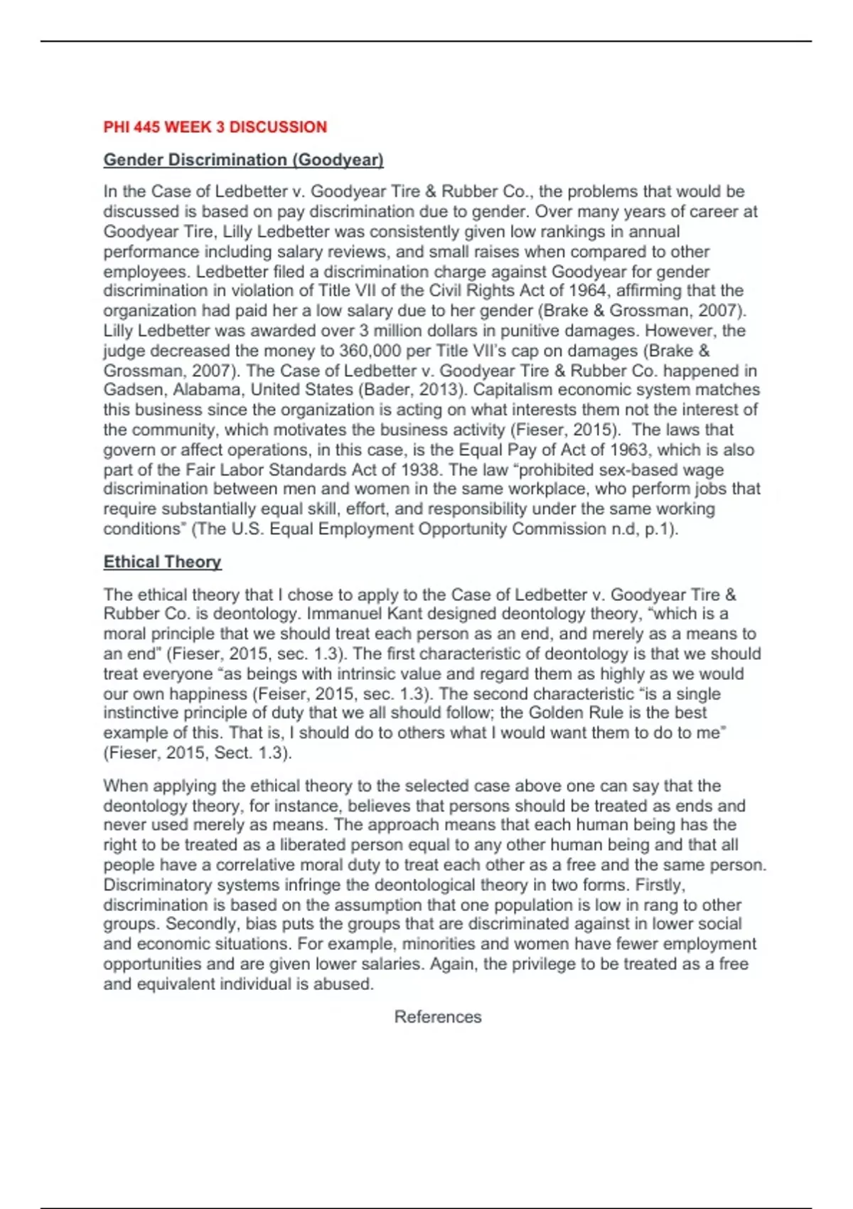 PHI 445 WEEK 3 DISCUSSION Gender Discrimination (Goodyear) In the Case of Ledbetter v. Goodyear Tire & Rubber Co., the problems that would be discussed is based on pay discrimination due to gender. Over many years of career at Goodyear Tire, Lilly Ledbetter was consistently given low rankings in annual performance including salary reviews, and small raises when compared to other employees. Ledbetter filed a discrimination charge against Goodyear for gender discrimination in violation of Title VII of the Civil Rights Act of 1964, affirming that the organization had paid her a low salary due to her gender (Brake & Grossman, 2007). Lilly Ledbetter was awarded over 3 million dollars in punitive damages. However, the judge decreased the money to 360,000 per Title VII’s cap on damages (Brake & Grossman, 2007). The Case of Ledbetter v. Goodyear Tire & Rubber Co. happened in Gadsen, Alabama, United States (Bader, 2013). Capitalism economic system matches this business since the organization is acting on what interests them not the interest of the community, which motivates the business activity (Fieser, 2015). The laws that govern or affect operations, in this case, is the Equal Pay of Act of 1963, which is also part of the Fair Labor Standards Act of 1938. The law “prohibited sex-based wage discrimination between men and women in the same workplace, who perform jobs that require substantially equal skill, effort, and responsibility under the same working conditions” (The U.S. Equal Employment Opportunity Commission n.d, p.1). Ethical Theory The ethical theory that I chose to apply to the Case of Ledbetter v. Goodyear Tire & Rubber Co. is deontology. Immanuel Kant designed deontology theory, “which is a moral principle that we should treat each person as an end, and merely as a means to an end” (Fieser, 2015, sec. 1.3). The first characteristic of deontology is that we should treat everyone “as beings with intrinsic value and regard them as highly as we would our own happiness (Feiser, 2015, sec. 1.3). The second characteristic “is a single instinctive principle of duty that we all should follow; the Golden Rule is the best example of this. That is, I should do to others what I would want them to do to me” (Fieser, 2015, Sect. 1.3). When applying the ethical theory to the selected case above one can say that the deontology theory, for instance, believes that persons should be treated as ends and never used merely as means. The approach means that each human being has the right to be treated as a liberated person equal to any other human being and that all people have a correlative moral duty to treat each other as a free and the same person. Discriminatory systems infringe the deontological theory in two forms. Firstly, discrimination is based on the assumption that one population is low in rang to other groups. Secondly, bias puts the groups that are discriminated against in lower social and economic situations. For example, minorities and women have fewer employment opportunities and are given lower salaries. Again, the privilege to be treated as a free and equivalent individual is abused.