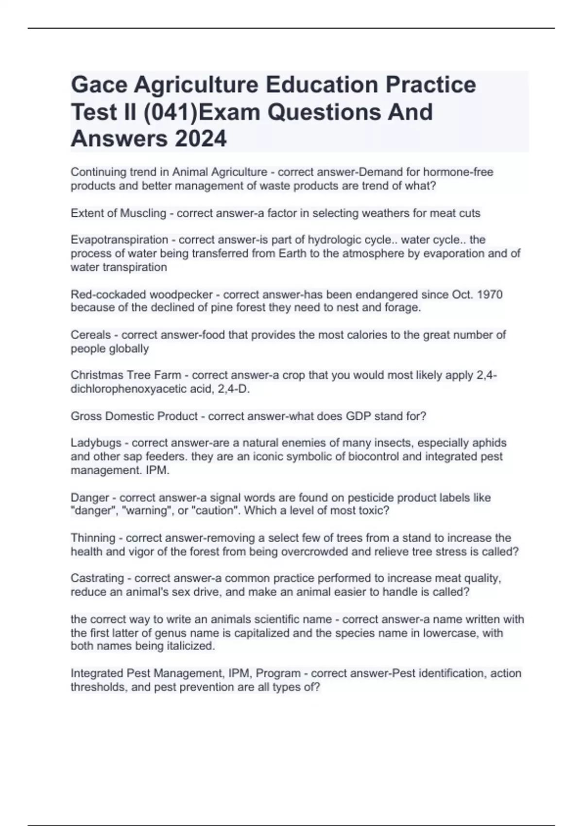 Continuing trend in Animal Agriculture - correct answer-Demand for hormone-free products and better management of waste products are trend of what? Extent of Muscling - correct answer-a factor in selecting weathers for meat cuts Evapotranspiration - correct answer-is part of hydrologic cycle.. water cycle.. the process of water being transferred from Earth to the atmosphere by evaporation and of water transpiration Red-cockaded woodpecker - correct answer-has been endangered since Oct. 1970 because of the declined of pine forest they need to nest and forage. Cereals - correct answer-food that provides the most calories to the great number of people globally Christmas Tree Farm - correct answer-a crop that you would most likely apply 2,4-dichlorophenoxyacetic acid, 2,4-D. Gross Domestic Product - correct answer-what does GDP stand for? Ladybugs - correct answer-are a natural enemies of many insects, especially aphids and other sap feeders. they are an iconic symbolic of biocontrol and integrated pest management. IPM. Danger - correct answer-a signal words are found on pesticide product labels like "danger", "warning", or "caution". Which a level of most toxic? Thinning - correct answer-removing a select few of trees from a stand to increase the health and vigor of the forest from being overcrowded and relieve tree stress is called? Castrating - correct answer-a common practice performed to increase meat quality, reduce an animal's sex drive, and make an animal easier to handle is called? the correct way to write an animals scientific name - correct answer-a name written with the first latter of genus name is capitalized and the species name in lowercase, with both names being italicized. Integrated Pest Management, IPM, Program - correct answer-Pest identification, action thresholds, and pest prevention are all types of?