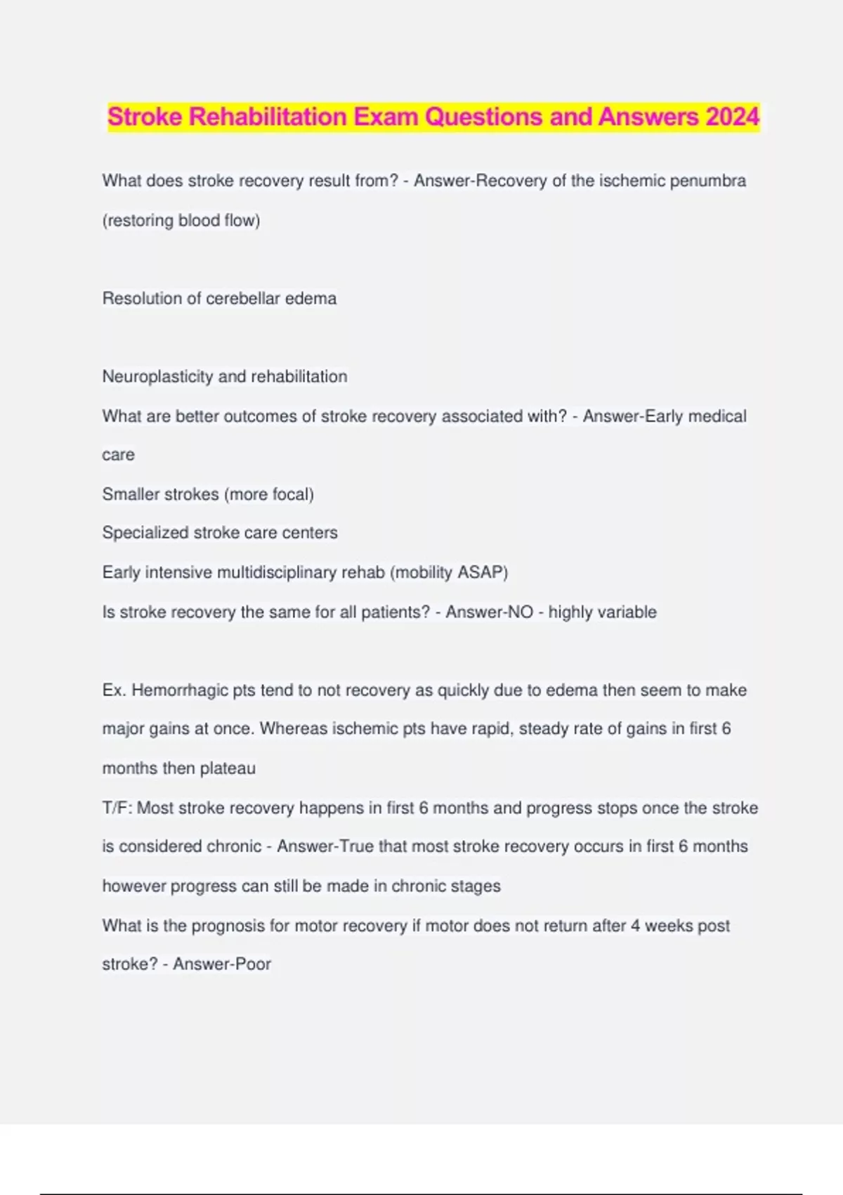 Stroke Rehabilitation Exam Questions and Answers 2024 What does stroke recovery result from? - Answer-Recovery of the ischemic penumbra (restoring blood flow) Resolution of cerebellar edema Neuroplasticity and rehabilitation What are better outcomes of stroke recovery associated with? - Answer-Early medical care Smaller strokes (more focal) Specialized stroke care centers Early intensive multidisciplinary rehab (mobility ASAP) Is stroke recovery the same for all patients? - Answer-NO - highly variable Ex. Hemorrhagic pts tend to not recovery as quickly due to edema then seem to make major gains at once. Whereas ischemic pts have rapid, steady rate of gains in first 6 months then plateau T/F: Most stroke recovery happens in first 6 months and progress stops once the stroke is considered chronic - Answer-True that most stroke recovery occurs in first 6 months however progress can still be made in chronic stages What is the prognosis for motor recovery if motor does not return after 4 weeks post stroke? - Answer-Poor What are mortality predictors of stroke? - Answer-History of past CVA, prolonged LOC, dysphagia, aspiration, pneumonia, age, increased ICP, and size of lesion What percent of stroke patients will need some level of assistance long term? - Answer- 66% (1/3) Is there a genetic effect on prognosis following a stroke? - Answer-Yes - there are genetic polymorphisms related to stroke recovery (BDNF production) Goals of stroke care units? - Answer-Rapid medical attention Limit neurologic damage Optimize medical status Initiate early rehab/functional mobilization Multidisciplinary inpatient units - reduction in mortality rates but only 38% of US hospitals and rehab centers have these units Who is on the stroke care team? - Answer-Patient and family Physicians (neurologist, cardiologist, surgeon, etc.) Nurses PT/OT SLP Dietician Social worker Neuropsychologists Respiratory, recreation and vocational therapists ICU/Acute care goals of post-stroke PT - Answer-Pt and family education Prevention of secondary complications Positioning, splinting Manage impairments EARLY MOBILIZATION: low intensity, monitor status closely Discharge planning (avg acute care stay is 5 days) Rehab goals of post-stroke PT - Answer-Same as acute care setting but patient will be more stable Focus on pt and family centered goals Maximize functional status and independence Discharge planning with the team - to home, community, work, recreational activities Equipment needs (DME, orthotics, splints, slings, gloves) Chronic phase post-stroke PT goals - Answer-Chronic (6 months and beyond) - home care - community rehab - outpatient - home exercise program Goals are focused on maintaining/continuing to improve ROM, strength, endurance, balance, functional mobility, independent participation in recreational and vocational activities What is the traditional neurorehab approach for post-stroke rehab? - Answer-NDT - based on neuromaturational and hierarchical theories of motor control. Commonly used in practice but limited evidence to show effectiveness. What is the contemporary approach in neurorehab? - Answer-Evidence-based concepts of motor control, motor learning and neuroplasticity. Different names, same approach: - Task Oriented Retraining - Motor Relearning Program - Functional Movement Re-education - Neuromuscular re-education Task Oriented Training steps - Answer-Task analysis Part-task practice Whole-task practice Transfer of training Task Analysis - Answer-Observing pts natural movements (safely