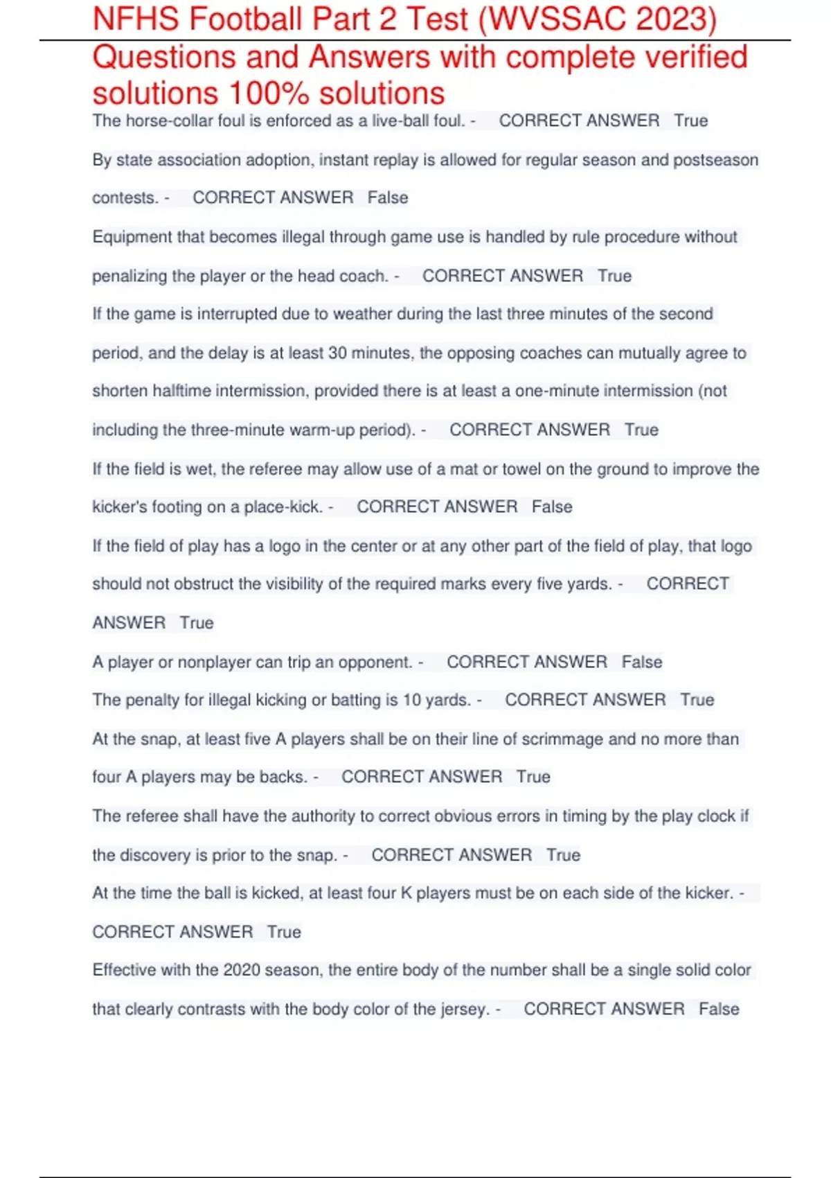 NFHS Football Part 2 Test (WVSSAC 2023) Questions and Answers with complete verified solutions 100% solutions