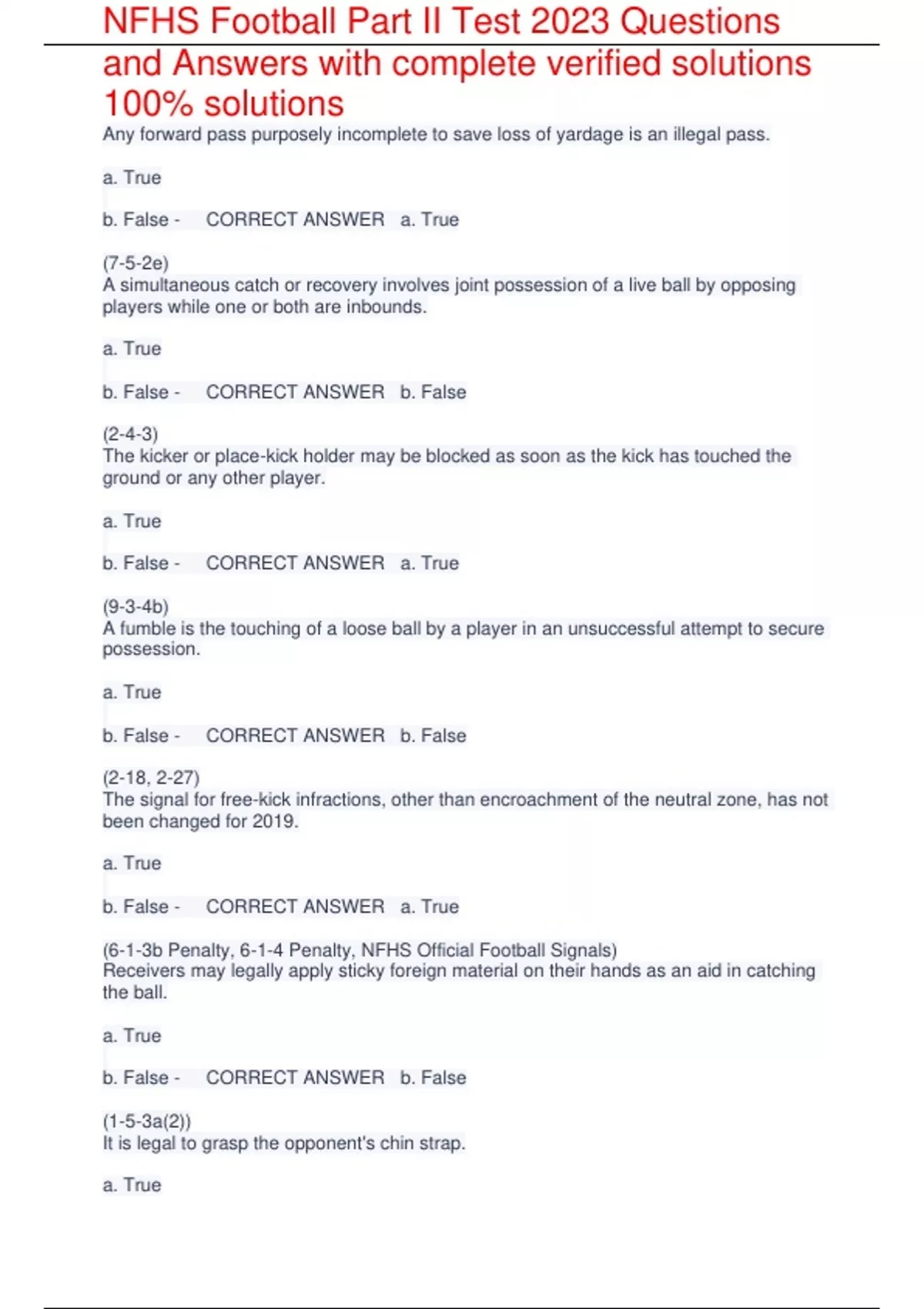 Any forward pass purposely incomplete to save loss of yardage is an illegal pass. a. True b. False - CORRECT ANSWER a. True (7-5-2e) A simultaneous catch or recovery involves joint possession of a live ball by opposing players while one or both are inbounds. a. True b. False - CORRECT ANSWER b. False (2-4-3) The kicker or place-kick holder may be blocked as soon as the kick has touched the ground or any other player. a. True b. False - CORRECT ANSWER a. True (9-3-4b) A fumble is the touching of a loose ball by a player in an unsuccessful attempt to secure possession. a. True b. False - CORRECT ANSWER b. False (2-18, 2-27) The signal for free-kick infractions, other than encroachment of the neutral zone, has not been changed for 2019. a. True b. False - CORRECT ANSWER a. True (6-1-3b Penalty, 6-1-4 Penalty, NFHS Official Football Signals) Receivers may legally apply sticky foreign material on their hands as an aid in catching the ball. a. True b. False - CORRECT ANSWER b. False (1-5-3a(2)) It is legal to grasp the opponent's chin strap