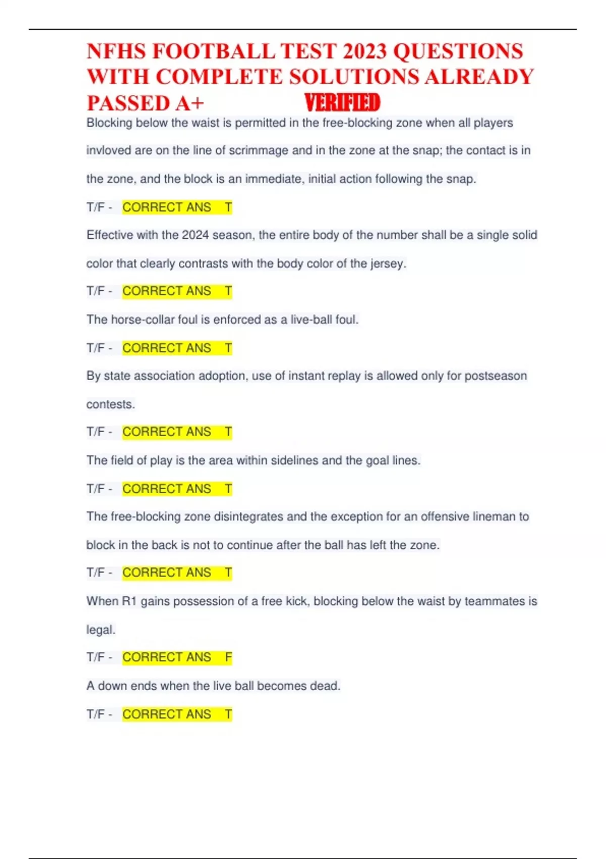 NFHS FOOTBALL TEST 2023 QUESTIONS WITH COMPLETE SOLUTIONS ALREADY PASSED A+ VERIFIED