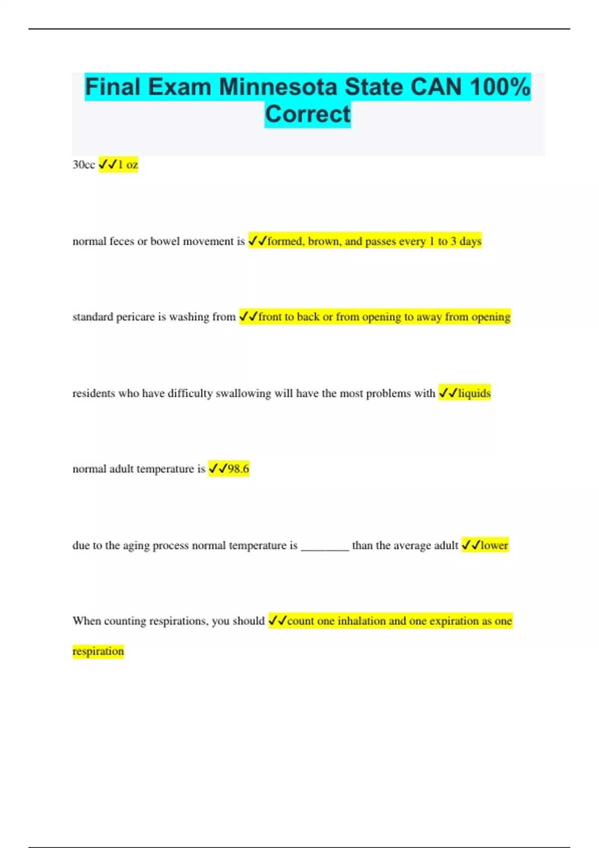 Final Exam Minnesota State CAN 100% Correct 30cc 1 oz normal feces or bowel movement is formed, brown, and passes every 1 to 3 days standard pericare is washing from front to back or from opening to away from opening residents who have difficulty swallowing will have the most problems with liquids normal adult temperature is 98.6 due to the aging process normal temperature is ________ than the average adult lower When counting respirations, you should count one inhalation and one expiration as one respiration when measuring pulse and respirations you should always count for 1 full minute normal adult respiratory rate is if you need to take vital signs of a person at rest, they should have been _______ or ________ for at least _________ minutes sitting or lying; 15 min to be a successful nursing assistant you must pass the course and test, have a positive attitude, and maintain good health and hygiene giving residents choices is part of the resident's __________________ Bill of Rights Good body mechanics is correctly making the best use of strength to lift or move residents when lifting a resident, you should stand with your feet about ________ inches apart 18 Standard precautions guidelines recommend wearing gloves when touching body fluids or items contaminated with body fluids for effective communication it is important to speak clearly and slowly A written outline which identifies a residents need and how health care workers will meet them A careplan When recording information you should use ink and include the date, time, and sign all entries with your name Hypertension blood pressure greater than 140/90; high blood pressure If the resident has a feeding tube and you do not think it is working correctly you should report it to your nurse ASAP the primary reason to wear support stockings (TED) to help circulation to the legs and feet Dementia the progressive deterioration that interferes with a person's life activities