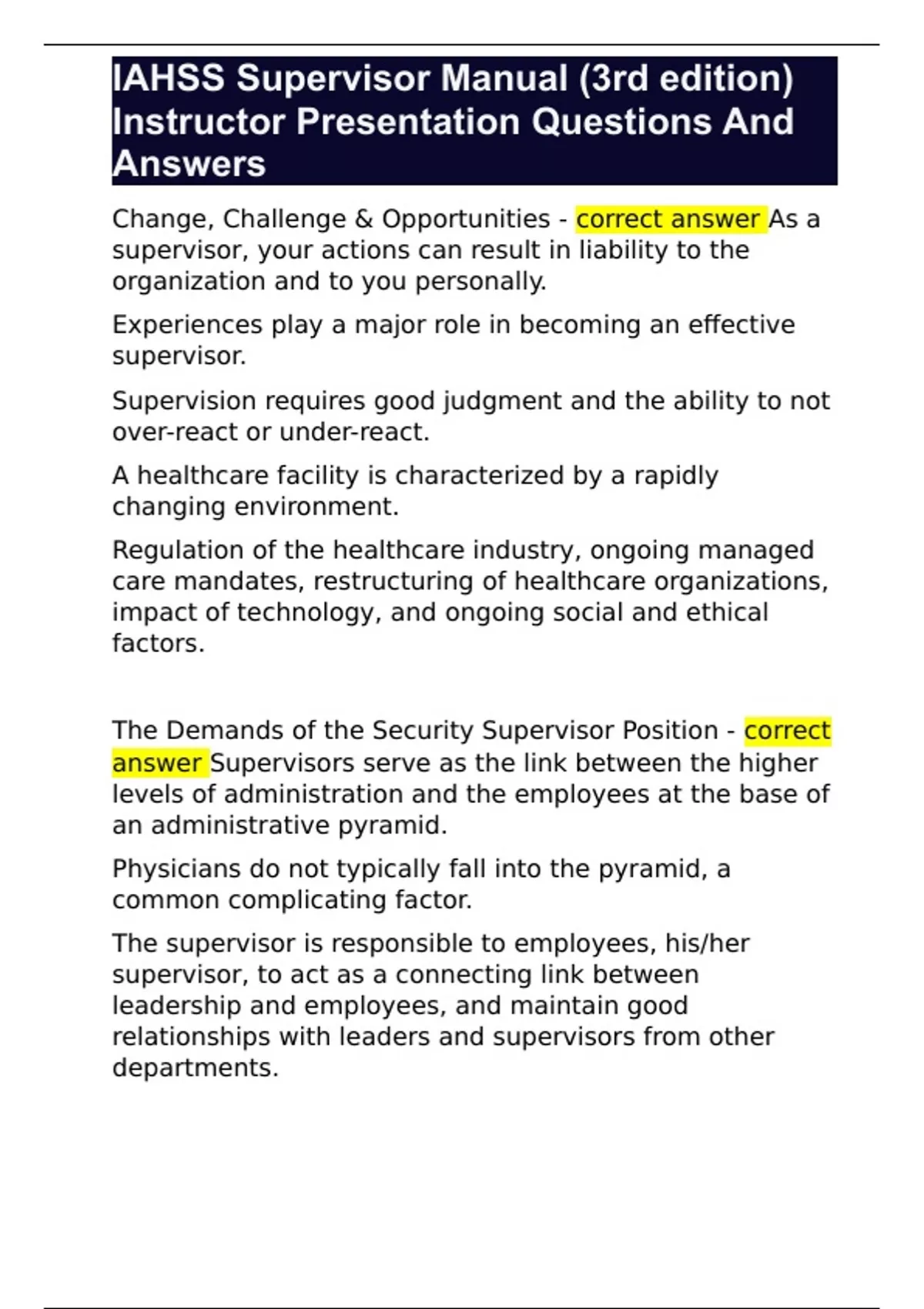 IAHSS Supervisor Manual (3rd edition) Instructor Presentation Questions And Answers