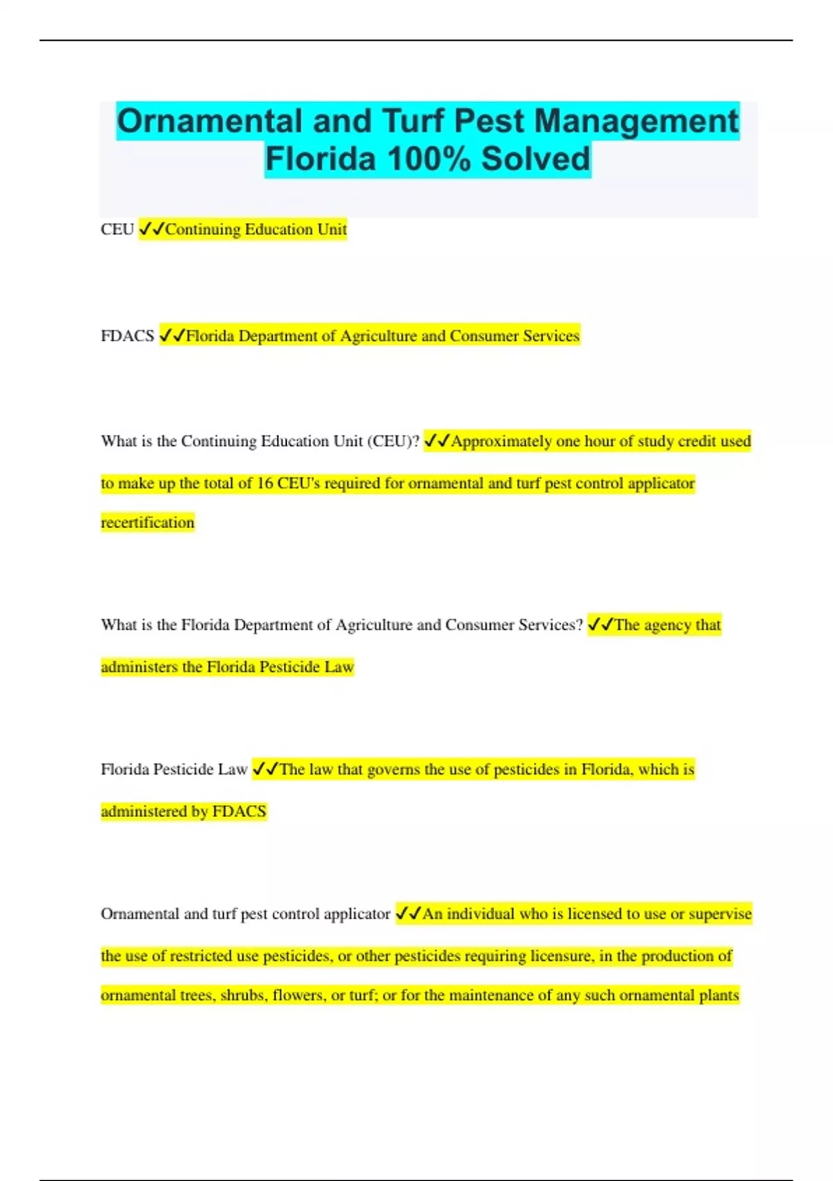Ornamental and Turf Pest Management Florida 100% Solved CEU Continuing Education Unit FDACS Florida Department of Agriculture and Consumer Services What is the Continuing Education Unit (CEU)? Approximately one hour of study credit used to make up the total of 16 CEU's required for ornamental and turf pest control applicator recertification What is the Florida Department of Agriculture and Consumer Services? The agency that administers the Florida Pesticide Law Florida Pesticide Law The law that governs the use of pesticides in Florida, which is administered by FDACS Ornamental and turf pest control applicator An individual who is licensed to use or supervise the use of restricted use pesticides, or other pesticides requiring licensure, in the production of ornamental trees, shrubs, flowers, or turf; or for the maintenance of any such ornamental plants or turf grasses growing in or on cemeteries, golf courses, parks, or athletic fields; but not including the use of supervision of restricted use fumigant pesticides. This category is valid for licensure of commercial and public applicators. Recertification The process by which licensed pesticide applicators accumulate continuing education units in order to keep the license valid. RUP Restricted Use Pesticides Restricted Use Pesticides (RUP) Pesticide for retail sale to, and use by, only certified applicators or persons under their direct supervision and only for those purposes covered by the applicator's certification. Certified applicators are licensed as either ______ or ______ Public applicator or Commercial Applicator What is a Public Applicator? A public applicator is a licensed applicator employed by a public or governmental agency. The license is only valid when performing work for the public or governmental agency. A public applicator fee is $_____ for a ______-year license. 100, four What is a commercial applicator? A commercial applicator is a licensed applicator who is licensed to apply restricted-use pesticides on any property provided they are certified in the category for which the applications are made. A commercial applicator is usually a contract applicator. The commercial applicator fee is $_____ for a _____-year license 250, four An ornamental and turf pest control applicator is a person who