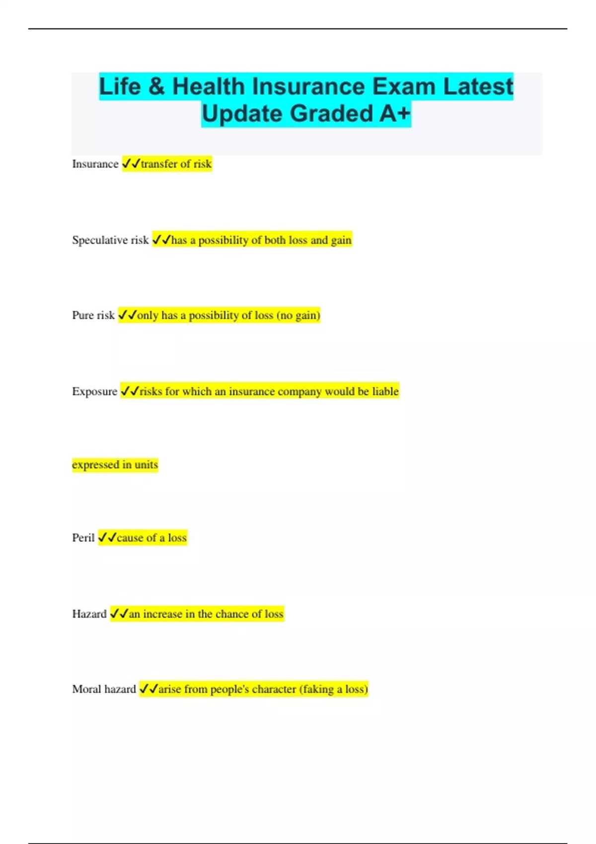 Life & Health Insurance Exam Latest Update Graded A+ Insurance transfer of risk Speculative risk has a possibility of both loss and gain Pure risk only has a possibility of loss (no gain) Exposure risks for which an insurance company would be liable expressed in units Peril cause of a loss Hazard an increase in the chance of loss Moral hazard arise from people's character (faking a loss) Morale hazard state of mind or careless attitude (accidentally leaving door unlocked) Methods of handling risk STARR Share, transfer, avoid, retain, reduce The law of large numbers the larger the group, the more accurately losses can be predicted Elements of insurable risk CANHAM Calculable, affordable, non-catastrophic, homogenous, accidental, measurable Adverse selection tendency for higher-risk individuals to get and keep insurance Reinsurance an insurance company (ceding) pays another insurance company (reinsurer) to assume some risk in the event of a catastrophic loss Facultative reinsurance reinsurer evaluates each risk before allowing the transfer Treaty reinsurance reinsurer accepts all risk of a certain type from the ceding company Stock insurer insurance company owned by shareholders who chose the board of directors taxable dividends can be paid from profits issues non-participating (non-par) policies Mutual insurer no shareholders, rather policyowners who chose the board of directors nontaxable dividends can be paid from profits (return of excess premium) issues participating (par) policies Fraternal benefit societies provides insurance and other social benefits to members members own certificates