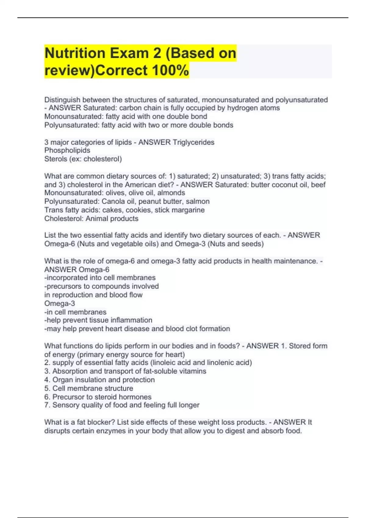 Distinguish between the structures of saturated, monounsaturated and polyunsaturated - ANSWER Saturated: carbon chain is fully occupied by hydrogen atoms Monounsaturated: fatty acid with one double bond Polyunsaturated: fatty acid with two or more double bonds 3 major categories of lipids - ANSWER Triglycerides Phospholipids Sterols (ex: cholesterol) What are common dietary sources of: 1) saturated; 2) unsaturated; 3) trans fatty acids; and 3) cholesterol in the American diet? - ANSWER Saturated: butter coconut oil, beef Monounsaturated: olives, olive oil, almonds Polyunsaturated: Canola oil, peanut butter, salmon Trans fatty acids: cakes, cookies, stick margarine Cholesterol: Animal products List the two essential fatty acids and identify two dietary sources of each. - ANSWER Omega-6 (Nuts and vegetable oils) and Omega-3 (Nuts and seeds) What is the role of omega-6 and omega-3 fatty acid products in health maintenance. - ANSWER Omega-6 -incorporated into cell membranes -precursors to compounds involved in reproduction and blood flow Omega-3 -in cell membranes -help prevent tissue inflammation -may help prevent heart disease and blood clot formation What functions do lipids perform in our bodies and in foods? - ANSWER 1. Stored form of energy (primary energy source for heart) 2. supply of essential fatty acids (linoleic acid and linolenic acid) 3. Absorption and transport of fat-soluble vitamins 4. Organ insulation and protection