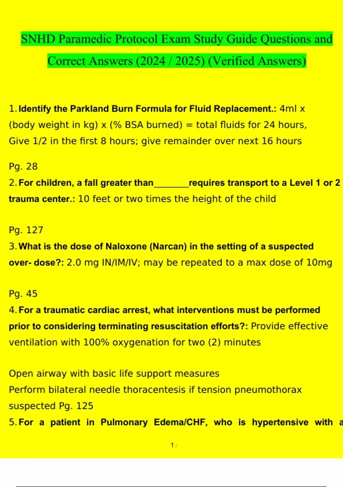 SNHD Paramedic Protocol Exam Study Guide Questions and Answers (2024 / 2025