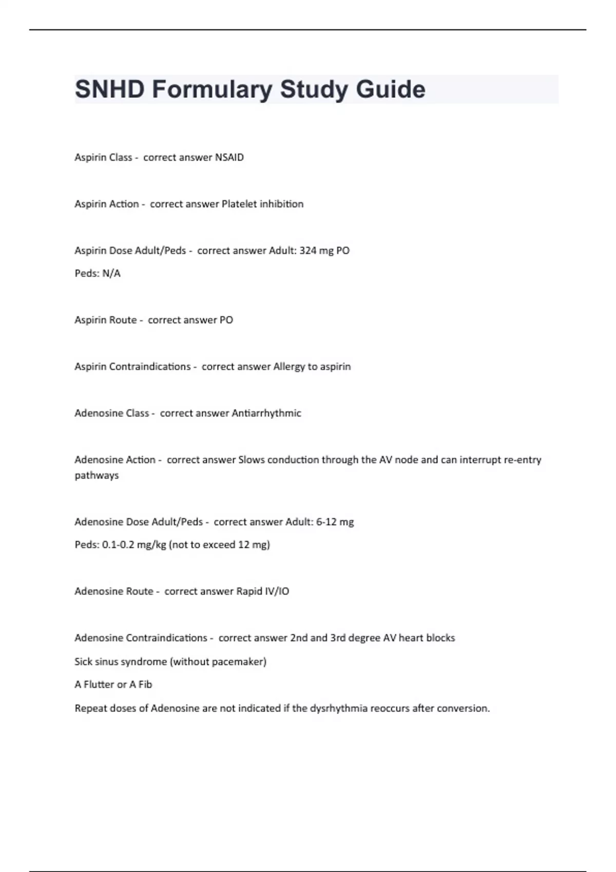SNHD Formulary Study Guide Aspirin Class - correct answer NSAID Aspirin Action - correct answer Platelet inhibition Aspirin Dose Adult/Peds - correct answer Adult: 324 mg PO Peds: N/A Aspirin Route - correct answer PO Aspirin Contraindications - correct answer Allergy to aspirin Adenosine Class - correct answer Antiarrhythmic Adenosine Action - correct answer Slows conduction through the AV node and can interrupt re-entry pathways Adenosine Dose Adult/Peds - correct answer Adult: 6-12 mg Peds: 0.1-0.2 mg/kg (not to exceed 12 mg) Adenosine Route - correct answer Rapid IV/IO Adenosine Contraindications - correct answer 2nd and 3rd degree AV heart blocks Sick sinus syndrome (without pacemaker) A Flutter or A Fib Repeat doses of Adenosine are not indicated if the dysrhythmia reoccurs after conversion.