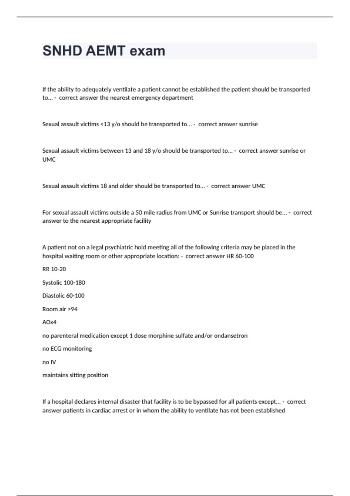 SNHD AEMT examIf the ability to adequately ventilate a patient cannot be established the patient should be transported to... - correct answer the nearest emergency department Sexual assault victims 13 y/o should be transported to... - correct answer sunrise Sexual assault victims between 13 and 18 y/o should be transported to... - correct answer sunrise or UMC Sexual assault victims 18 and older should be transported to... - correct answer UMC For sexual assault victims outside a 50 mile radius from UMC or Sunrise transport should be... - correct answer to the nearest appropriate facility A patient not on a legal psychiatric hold meeting all of the following criteria may be placed in the hospital waiting room or other appropriate location: - correct answer HR 60-100 RR 10-20 Systolic 100-180 Diastolic 60-100 Room air 94 AOx4 no parenteral medication except 1 dose morphine sulfate and/or ondansetron no ECG monitoring no IV maintains sitting position If a hospital declares internal disaster that facility is to be bypassed for all patients except... - correct answer patients in cardiac arrest or in whom the ability to ventilate has not been established