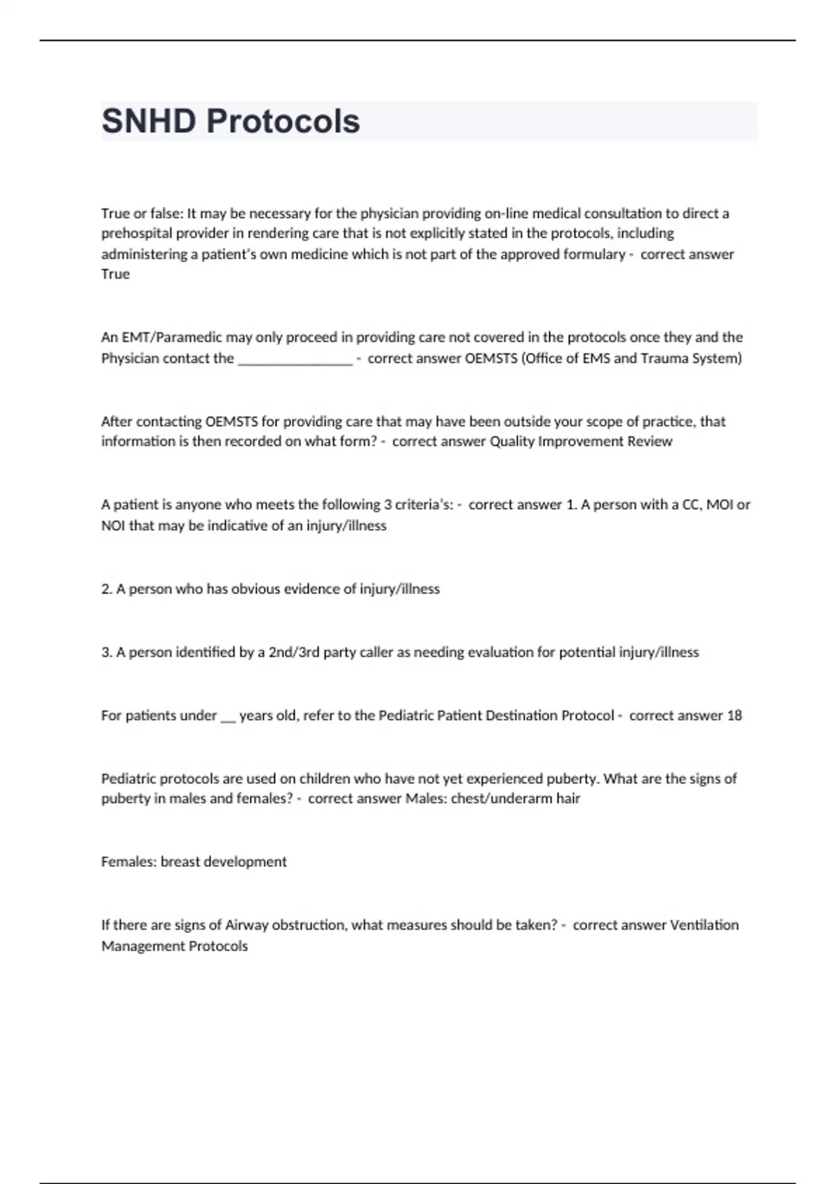 SNHD ProtocolsTrue or false: It may be necessary for the physician providing on-line medical consultation to direct a prehospital provider in rendering care that is not explicitly stated in the protocols, including administering a patient’s own medicine which is not part of the approved formulary - correct answer True An EMT/Paramedic may only proceed in providing care not covered in the protocols once they and the Physician contact the _______________ - correct answer OEMSTS (Office of EMS and Trauma System) After contacting OEMSTS for providing care that may have been outside your scope of practice, that information is then recorded on what form? - correct answer Quality Improvement Review A patient is anyone who meets the following 3 criteria’s: - correct answer 1. A person with a CC, MOI or NOI that may be indicative of an injury/illness 2. A person who has obvious evidence of injury/illness 3. A person identified by a 2nd/3rd party caller as needing evaluation for potential injury/illness For patients under __ years old, refer to the Pediatric Patient Destination Protocol - correct answer 18 Pediatric protocols are used on children who have not yet experienced puberty. What are the signs of puberty in males and females? - correct answer Males: chest/underarm hair Females: breast development If there are signs of Airway obstruction, what measures should be taken? - correct answer Ventilation Management Protocols