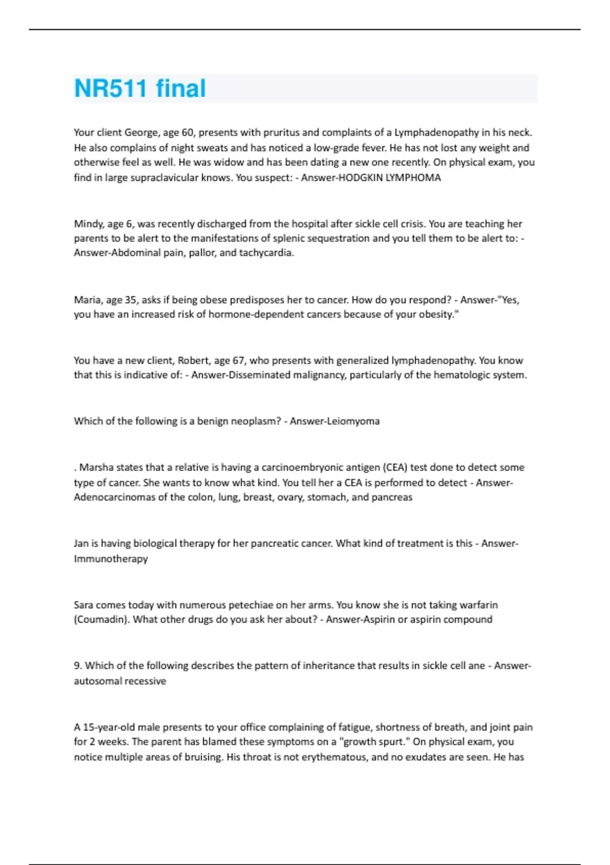 Your client George, age 60, presents with pruritus and complaints of a Lymphadenopathy in his neck. He also complains of night sweats and has noticed a low-grade fever. He has not lost any weight and otherwise feel as well. He was widow and has been dating a new one recently. On physical exam, you find in large supraclavicular knows. You suspect: - Answer-HODGKIN LYMPHOMA Mindy, age 6, was recently discharged from the hospital after sickle cell crisis. You are teaching her parents to be alert to the manifestations of splenic sequestration and you tell them to be alert to: - Answer-Abdominal pain, pallor, and tachycardia. Maria, age 35, asks if being obese predisposes her to cancer. How do you respond? - Answer-"Yes, you have an increased risk of hormone-dependent cancers because of your obesity." You have a new client, Robert, age 67, who presents with generalized lymphadenopathy. You know that this is indicative of: - Answer-Disseminated malignancy, particularly of the hematologic system. Which of the following is a benign neoplasm? - Answer-Leiomyoma . Marsha states that a relative is having a carcinoembryonic antigen (CEA) test done to detect some type of cancer. She wants to know what kind. You tell her a CEA is performed to detect - AnswerAdenocarcinomas of the colon, lung, breast, ovary, stomach, and pancreas Jan is having biological therapy for her pancreatic cancer. What kind of treatment is this - AnswerImmunotherapy Sara comes today with numerous petechiae on her arms. You know she is not taking warfarin (Coumadin). What other drugs do you ask her about? - Answer-Aspirin or aspirin compound 9. Which of the following describes the pattern of inheritance that results in sickle cell ane - Answerautosomal recessive A 15-year-old male presents to your office complaining of fatigue, shortness of breath, and joint pain for 2 weeks. The parent has blamed these symptoms on a "growth spurt." On physical exam, you notice multiple areas of bruising. His throat is not erythematous, and no exudates are seen. He haspalpable splenomegaly, and his rapid strep and mono tests are negative. Which of the following is the most likely diagnosis? - Answer-Acute lymphocytic leukemia (ALL) Your client Mrs. Young, age 64, is here to see you because she has pain in her left breast. She reports no pain in her right breast and no noted lesions or masses on breast self-exam, which she performs monthly. You know that: - Answer-She must be sent for mammogram as soon as possible A 30-year-old male nurse presents to the emergency department. He was stuck with a needle yesterday while working and found out today that the patient involved in the needle stick is human immunodeficiency virus (HIV) positive. What is the time window for starting postexposure prophylaxis to help prevent the transmission of HIV - Answer-72 hours Jill has just been given a diagnosis of human immunodeficiency virus (HIV) and has a normal initial Pap smear. When do the Centers for Disease Control and Prevention (CDC) guidelines state she should have a repeat Pap test? - Answer-in 6 months