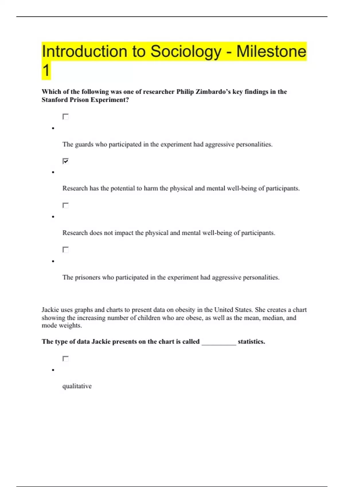 Introduction to Sociology - Milestone 1 Which of the following was one of researcher Philip Zimbardo’s key findings in the Stanford Prison Experiment? • The guards who participated in the experiment had aggressive personalities. • Research has the potential to harm the physical and mental well-being of participants. • Research does not impact the physical and mental well-being of participants. • The prisoners who participated in the experiment had aggressive personalities. Jackie uses graphs and charts to present data on obesity in the United States. She creates a chart showing the increasing number of children who are obese, as well as the mean, median, and mode weights. The type of data Jackie presents on the chart is called __________ statistics. • qualitative • spurious • inferential • descriptive Which of the following sociologists produced research demonstrating the challenges of the participant observation method? • William Foot Whyte • W.E.B. Du Bois • Lois Benjamin • Max Weber Which of the following approaches emphasizes issues that arise due to differences between races? • Symbolic interaction theory • Power elite theory • Structural functional theory •