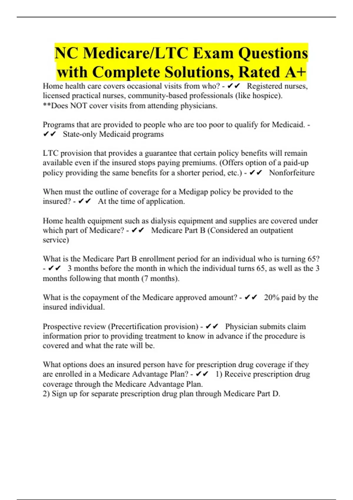 NC Medicare/LTC Exam Questions with Complete Solutions, Rated A+