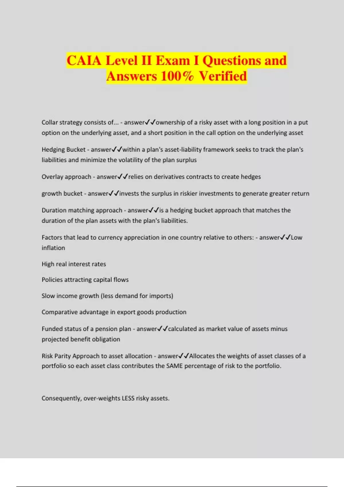 CAIA Level II Exam I Questions and Answers 100% Verified Collar strategy consists of... - answerownership of a risky asset with a long position in a put option on the underlying asset, and a short position in the call option on the underlying asset Hedging Bucket - answerwithin a plan's asset-liability framework seeks to track the plan's liabilities and minimize the volatility of the plan surplus Overlay approach - answerrelies on derivatives contracts to create hedges growth bucket - answerinvests the surplus in riskier investments to generate greater return Duration matching approach - answeris a hedging bucket approach that matches the duration of the plan assets with the plan's liabilities. Factors that lead to currency appreciation in one country relative to others: - answerLow inflation High real interest rates Policies attracting capital flows Slow income growth (less demand for imports) Comparative advantage in export goods production Funded status of a pension plan - answercalculated as market value of assets minus projected benefit obligation Risk Parity Approach to asset allocation - answerAllocates the weights of asset classes of a portfolio so each asset class contributes the SAME percentage of risk to the portfolio. Consequently, over-weights LESS risky assets. Security Selection... - answerAsset class return relative to a benchmark Strategic asset allocation... - answerCalculated as the long-term asset allocation weights multiplied by the benchmark returns for each asset class Market Timing AKA Tactical Asset Allocation - answerEarning excess returns by changing the asset class weights from target asset class weights Performance during a crisis - answerMacro funds = good Managed futures = good Government bonds = good Hedge Fund Arbitrage = bad Four core factors that affect the risk of plan liabilities - answer1. interest rate levels and direction 2. inflation (both realized and expected) 3. the retirement cycle 4. mortality risk Three approaches to risk measurement for defined benefit plan - answer1. Asset-focused risk management 2. Asset-liability risk management 3. Integrated asset-liability risk management Asset-focused risk management - answerConsiders only the risk of plan assets Asset-liability risk management - answerfocuses on the surplus of plan assets over liabilities (most important high-level risk is the risk aka volatility of the surplus) Integrated asset-liability risk management - answerintegrates management of the surplus with the operations of the plan sponsor An asset with HIGH volatility and POSITIVE correlation with plan liabilities... - answercan still be considered to have low risk under asset-liability framework Duration matching - answerIn DB plans tries to match assets and liabilities based upon duration (effective maturity)... addresses interest rate risk.. uses different fixed income instruments (not derivatives) Cash Flow matching - answerIn DB plans tries to match the timing of actual cash flows... relies heavily upon bond ladders (portfolio of fixed income where each bond has a different maturity date) Current Account - answermeasures trade in goods and services for a country Reserve Account - answerrecords transactions in foreign currencies affected by inflows and outflows from international trade and investment Persistent trade deficits result in... - answertrading capital and financial assets for the goods and services of another country Commodity exports' affect on reserve account - answerbecause commodity prices can be highly volatile, countries with commodity-dependent economies have established STABILIZATION funds to smooth the impact of commodity prices Change in Reserve Account = .... - answerChange in current account + change in capital account Current account surplus - answera country exports more than it imports Capital account - answermeasures cross-border investment, such as loans or purchases and sales of assets. Net inflows = capital account surplus A country's balance of payments accounts - answer1. current account 2. capital account 3. reserve account Four types of Sovereign Wealth Funds - answer1. Stabilization funds = smooth volatility (invests significantly in fixed income) 2. Savings funds = benefit future g