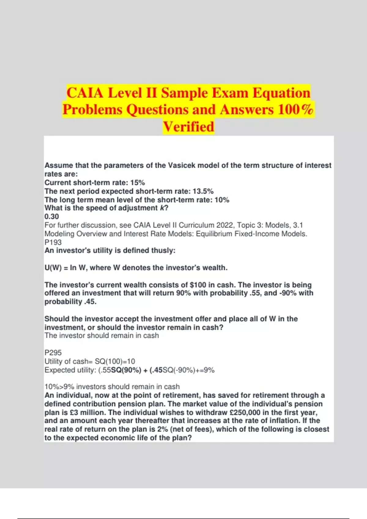 CAIA Level II Sample Exam Equation Problems Questions and Answers 100% Verified Assume that the parameters of the Vasicek model of the term structure of interest rates are: Current short-term rate: 15% The next period expected short-term rate: 13.5% The long term mean level of the short-term rate: 10% What is the speed of adjustment k? 0.30 For further discussion, see CAIA Level II Curriculum 2022, Topic 3: Models, 3.1 Modeling Overview and Interest Rate Models: Equilibrium Fixed-Income Models. P193 An investor's utility is defined thusly: U(W) = ln W, where W denotes the investor's wealth. The investor's current wealth consists of $100 in cash. The investor is being offered an investment that will return 90% with probability .55, and -90% with probability .45. Should the investor accept the investment offer and place all of W in the investment, or should the investor remain in cash? The investor should remain in cash P295 Utility of cash= SQ(100)=10 Expected utility: (.55SQ(90%) + (.45SQ(-90%)+=9% 10%>9% investors should remain in cash An individual, now at the point of retirement, has saved for retirement through a defined contribution pension plan. The market value of the individual's pension plan is £3 million. The individual wishes to withdraw £250,000 in the first year, and an amount each year thereafter that increases at the rate of inflation. If the real rate of return on the plan is 2% (net of fees), which of the following is closest to the expected economic life of the plan? 13.85 years Firm XYZ's defined benefit pension plan has a projected benefit obligation (PBO) of $100 million and current assets of $100 million. The duration of the pension's liabilities is 10.0 years, while the fund's assets are entirely comprised of a 5.0- year, zero-coupon riskless bond. Assume that all interest rates of all maturities and credit-worthiness immediately rise by 1.0%. Which of the following situations best describes the plan's funded status after the interest rate changes? 5% overfunded 100.015=5 Canada experienced a CAD 1 billion increase in its reserve account while having a CAD 3 billion deficit in its capital account. What was the current account surplus or deficit of Canada? CAD 4 billion surplus Change in Reserve account = Change in current account + Change in capital account Change in current account = 1-(-3)=4 An analyst uses historical data to estimate that the returns of a real estate fund have a beta of 0.40. The analyst then discovers that the return series is smoothed and has a first-order autocorrelation coefficient of 0.40. Which of the following values is the best estimate of the beta of the true (unsmoothed) series of returns for the real estate fund? Check the card for the question A reported price series of real estate values has been found to be smoothed according to the following relationship: *see pictured Assuming that α = .75 and that the most recent reported price change was +$10, which of the following values is the best estimate of the amount by which the most recent true price exceeds the previous reported price? Answer to last question $13.33 10/0.75 = 13.333 A four-year old PE fund required a cash contribution (capital call) of $100 at the end of Year 0 and $100 and the end of Year 1. The PE fund has an NAV at the end of Year 4 of $279.51. The public equity market index generated an annual return of 0% in the first three years and 22.657% in the fourth and final year. What is the amount by which the internal rate of return (IRR) of the PE Fund exceeded the IRR using the PME method? 4.00% -200 * (1 + 0.22657) = $245.31 in the fourth year PME-IRR(-100, -100, 0, 0, $245.31) = 6% For this item, the IRR of these cash flows (-100, -100, 0, 0, $279.51) = 10% Hence, the fund outperformed the public market by 4% The net operating income (NOI) of a property is estimated to be $1 million per year and its value is estimated to be $8 million. Mortgages on similar properties are yielding 9.75% and marginal income tax rates are 40%. What is the cap rate of the property? Cap rate = NOI/Value = 1M/8M = 12.5% A leveraged hedge fund strategy generates a retu