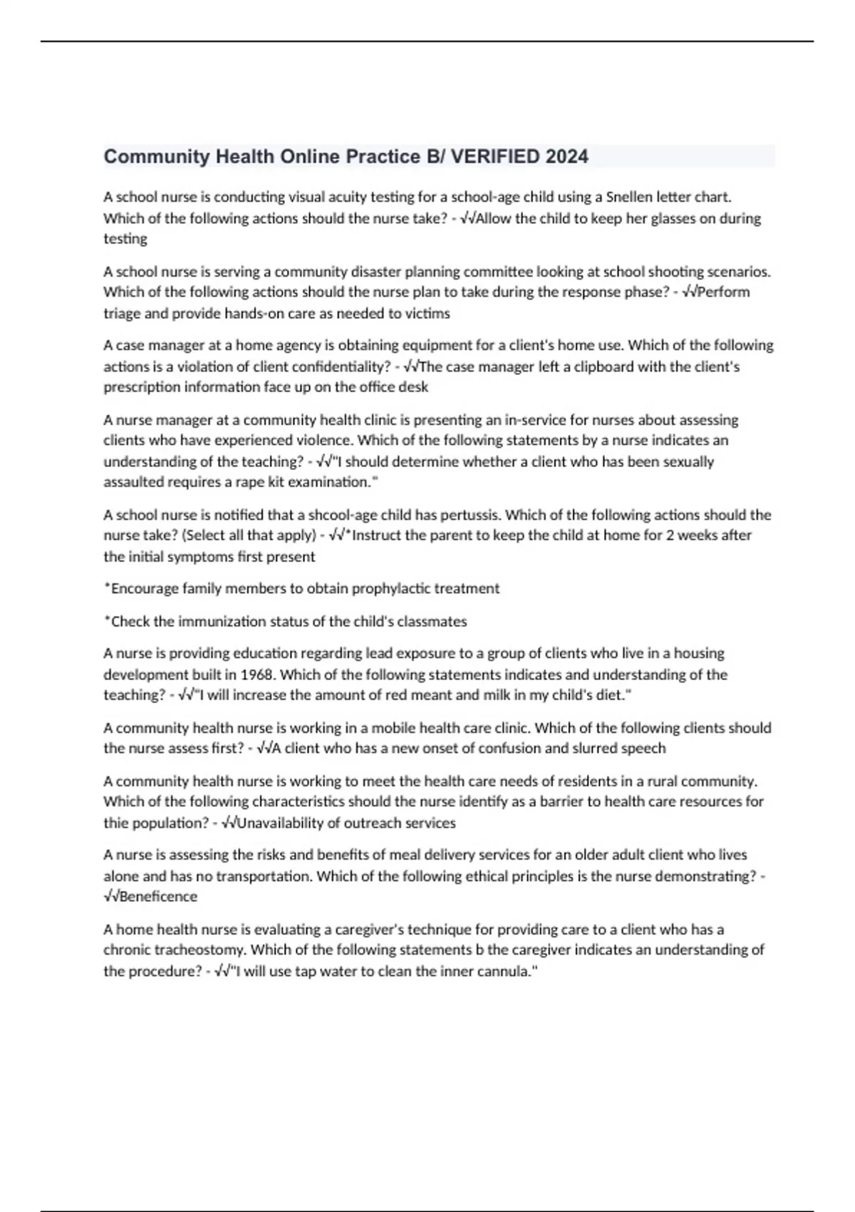 A school nurse is conducting visual acuity testing for a school-age child using a Snellen letter chart. Which of the following actions should the nurse take? - √√Allow the child to keep her glasses on during testing A school nurse is serving a community disaster planning committee looking at school shooting scenarios. Which of the following actions should the nurse plan to take during the response phase? - √√Perform triage and provide hands-on care as needed to victims
