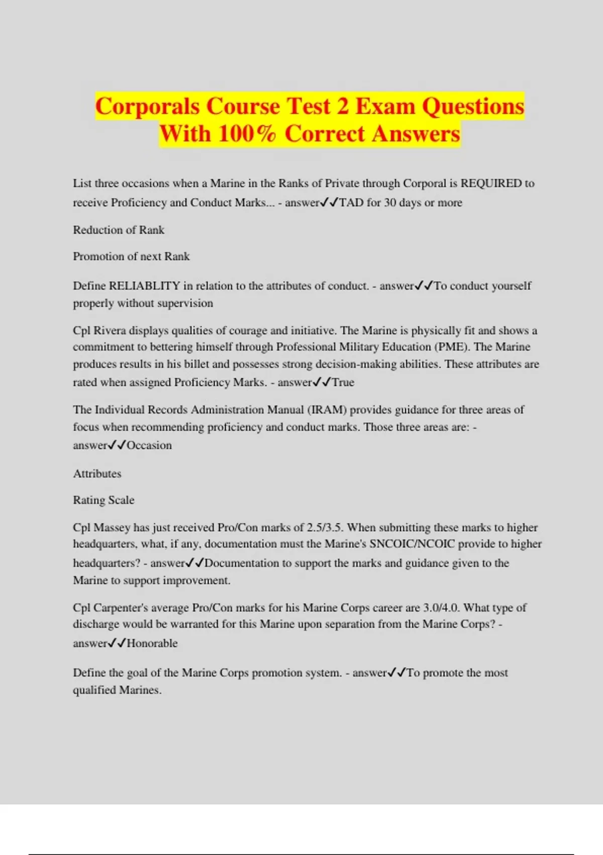 Corporals Course Test 2 Exam Questions With 100% Correct Answers List three occasions when a Marine in the Ranks of Private through Corporal is REQUIRED to receive Proficiency and Conduct Marks... - answerTAD for 30 days or more Reduction of Rank Promotion of next Rank Define RELIABLITY in relation to the attributes of conduct. - answerTo conduct yourself properly without supervision Cpl Rivera displays qualities of courage and initiative. The Marine is physically fit and shows a commitment to bettering himself through Professional Military Education (PME). The Marine produces results in his billet and possesses strong decision-making abilities. These attributes are rated when assigned Proficiency Marks. - answerTrue The Individual Records Administration Manual (IRAM) provides guidance for three areas of focus when recommending proficiency and conduct marks. Those three areas are: - answerOccasion Attributes Rating Scale Cpl Massey has just received Pro/Con marks of 2.5/3.5. When submitting these marks to higher headquarters, what, if any, documentation must the Marine's SNCOIC/NCOIC provide to higher headquarters? - answerDocumentation to support the marks and guidance given to the Marine to support improvement. Cpl Carpenter's average Pro/Con marks for his Marine Corps career are 3.0/4.0. What type of discharge would be warranted for this Marine upon separation from the Marine Corps? - answerHonorable Define the goal of the Marine Corps promotion system. - answerTo promote the most qualified Marines