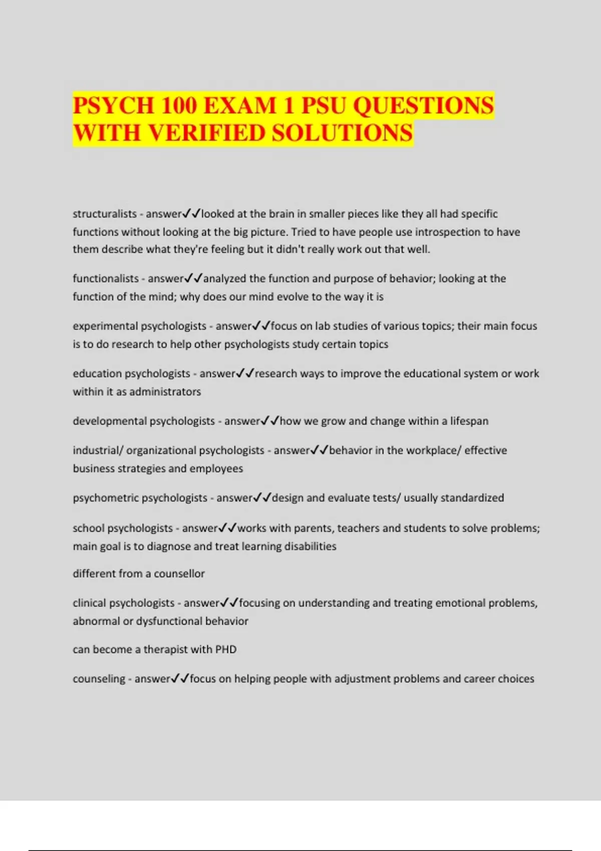 PSYCH 100 EXAM 1 PSU QUESTIONS WITH VERIFIED SOLUTIONS structuralists - answerlooked at the brain in smaller pieces like they all had specific functions without looking at the big picture. Tried to have people use introspection to have them describe what they're feeling but it didn't really work out that well. functionalists - answeranalyzed the function and purpose of behavior; looking at the function of the mind; why does our mind evolve to the way it is experimental psychologists - answerfocus on lab studies of various topics; their main focus is to do research to help other psychologists study certain topics education psychologists - answerresearch ways to improve the educational system or work within it as administrators developmental psychologists - answerhow we grow and change within a lifespan industrial/ organizational psychologists - answerbehavior in the workplace/ effective business strategies and employees psychometric psychologists - answerdesign and evaluate tests/ usually standardized school psychologists - answerworks with parents, teachers and students to solve problems; main goal is to diagnose and treat learning disabilities different from a counsellor clinical psychologists - answerfocusing on understanding and treating emotional problems, abnormal or dysfunctional behavior can become a therapist with PHD counseling - answerfocus on helping people with adjustment problems and career choices trained in diagnosing and treating mental health disorders but its more with healthy people and not severe cases difference between clinical and psychiatrists - answerPsychiatrist went to medical school and can prescribe medicine to treat mental disorders clinical get's PhD and it's more competitive, you have to do research and a dissertation, can diagnose and treat mental disorders but can not prescribe medicine Operationally defining a variable - answerdefining a term from the hypothesis in a measurable way How what in question will be measured How to make sure the people reading your research understand what exactly you're trying to find Have to use a test or instrument that has already been published Case Study - answerDetailed account of an individual being studied and its rare because it's usually only 1-2 people with a very unique situation EX: Jeanne Observational Study - answerNaturalistic observation: going to where things naturally occur and observe what happens (Jane Goodall) Laboratory Study - answerobserving someone or some type of behavior where you have set things up to be a certain way Tests - answerStandardized: uniform procedures for giving and sc
