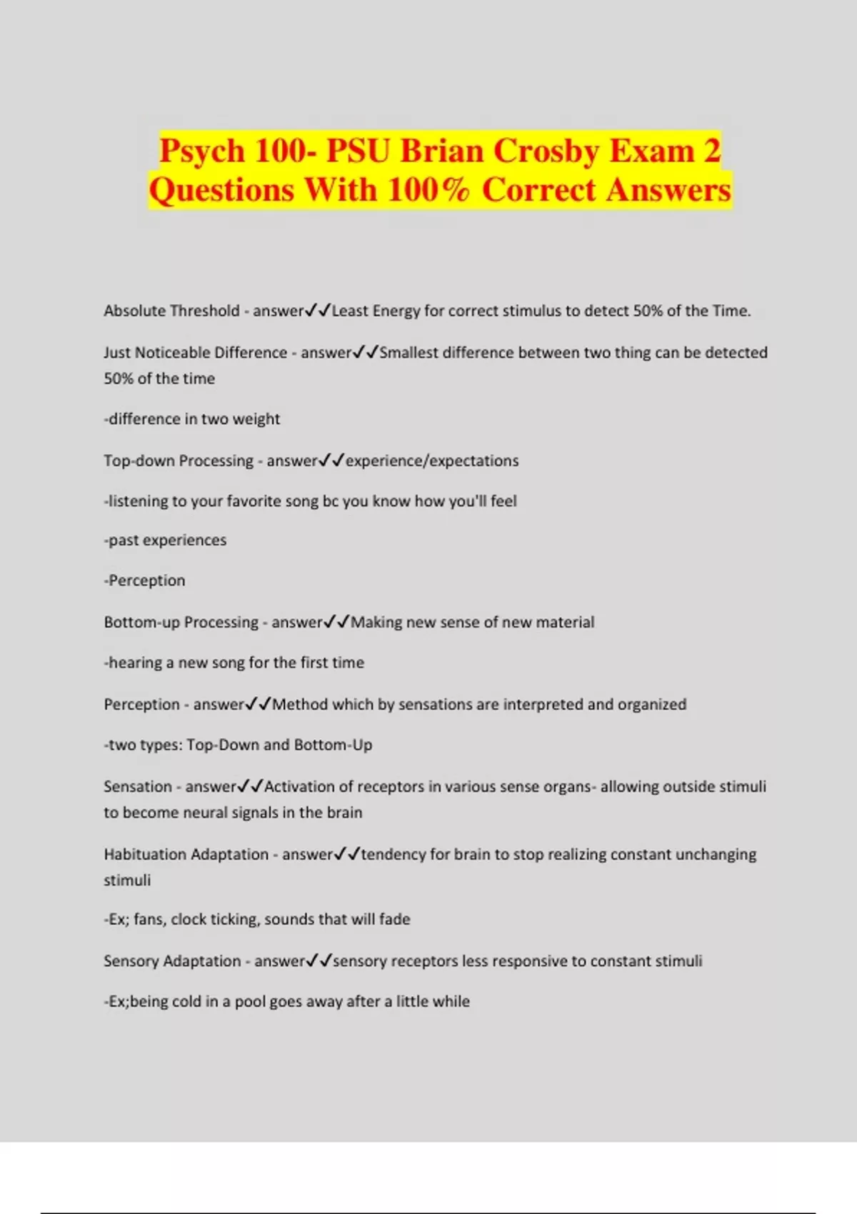 Psych 100- PSU Brian Crosby Exam 2 Questions With 100% Correct Answers Absolute Threshold - answerLeast Energy for correct stimulus to detect 50% of the Time. Just Noticeable Difference - answerSmallest difference between two thing can be detected 50% of the time -difference in two weight Top-down Processing - answerexperience/expectations -listening to your favorite song bc you know how you'll feel -past experiences -Perception Bottom-up Processing - answerMaking new sense of new material -hearing a new song for the first time Perception - answerMethod which by sensations are interpreted and organized -two types: Top-Down and Bottom-Up Sensation - answerActivation of receptors in various sense organs- allowing outside stimuli to become neural signals in the brain Habituation Adaptation - answertendency for brain to stop realizing constant unchanging stimuli -Ex; fans, clock ticking, sounds that will fade Sensory Adaptation - answersensory receptors less responsive to constant stimuli -Ex;being cold in a pool goes away after a little while -getting used to smell of cigarette smoke after being in room -touch/taste/smell Order That Light Travels in Eye - answerCornea Iris Pupil Lens Retina (CIP LR) Cornea - answer1st stop of light focus's on light coming in Iris - answermuscle that controls size of pupil Pupil - answerWhen light enters interior of the eye Lens - answerhelps to focus light to the retina Visual Accommodation - answerWhen the lens change shape to focus in on something Retina - answer-Contains photo receptor cells -light gets covered to electrical impulses -3 Layers 3 Layers of the Retina - answer1) Light passes through ganglion and bipolar cells 2)reaches and stimulates rods and cones 3)Nerve impulses from rods and cones travel alone a nerve pathway to the brain How does light become a Impulse - answerLight Sensory Impul