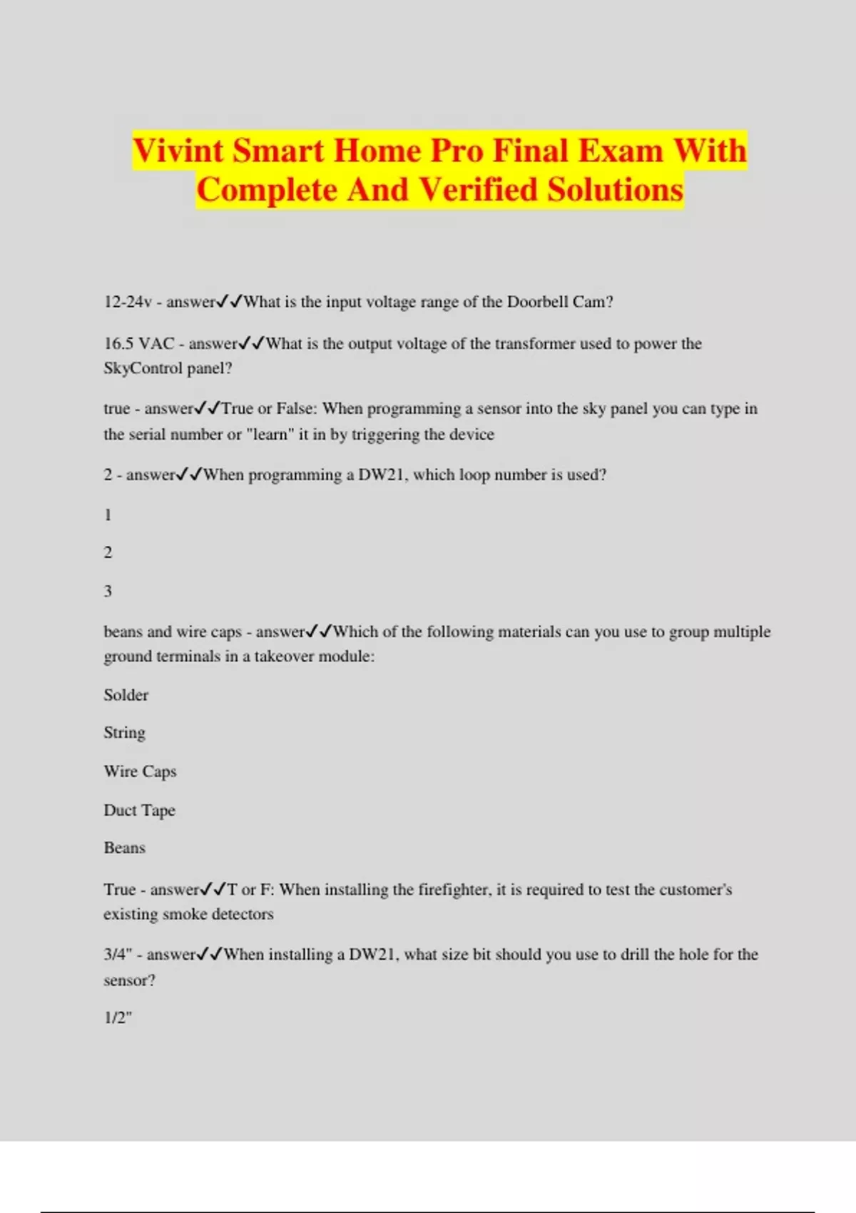 Vivint Smart Home Pro Final Exam With Complete And Verified Solutions 12-24v - answerWhat is the input voltage range of the Doorbell Cam? 16.5 VAC - answerWhat is the output voltage of the transformer used to power the SkyControl panel? true - answerTrue or False: When programming a sensor into the sky panel you can type in the serial number or "learn" it in by triggering the device 2 - answerWhen programming a DW21, which loop number is used? 1 2 3 beans and wire caps - answerWhich of the following materials can you use to group multiple ground terminals in a takeover module: Solder String Wire Caps Duct Tape Beans True - answerT or F: When installing the firefighter, it is required to test the customer's existing smoke detectors 3/4" - answerWhen installing a DW21, what size bit should you use to drill the hole for the sensor? 1/2" 3/8" 3/4" 1" True - answerT or F: When installing the TAKE-345, you must ensure that the transformer is supplying power to the power supply before the battery. True - answerT or F: You are required to test signals from all secondary keypads and key fobs even though they are not detection devices False - answerT or F: When running power to the TAKE-345 polarity does not apply - answerWhat is the correct height at which to install the PIR2? 7 ft At least 5 ft At least 7 ft At 7.5 ft How would you program a CO3 if mounted on a hallway wall? Loop 1 Zone 8 Loop 1 Zone 14 Loop 3 Zone 4 Loop 1 Zone 4 - answer When installing a DW21 into a metal door frame, with a wooden door, what should you be sure to use? Metal Drill bit A DW11 should be used on all metal door frames 3/4" insulated magnet Eye goggles - answer True - answerT or F: Panic Pendants are programmed as an audible alarm T or F: The Firefighter may be installed next to a stand-alone battery-powered smoke detector - answer Which of the following zone/sensor types are correct when programming an SMKT3? Type 9 - Freeze Detect Type 7 - Freeze Detect Type 9 - Heat detect Type 6 - heat detect type 1 - heat detect type 8 - freeze detect type 5 - smoke detect type 7 - smoke detect type 9 - smoke detect - answer When installing a DW21 where is the appr