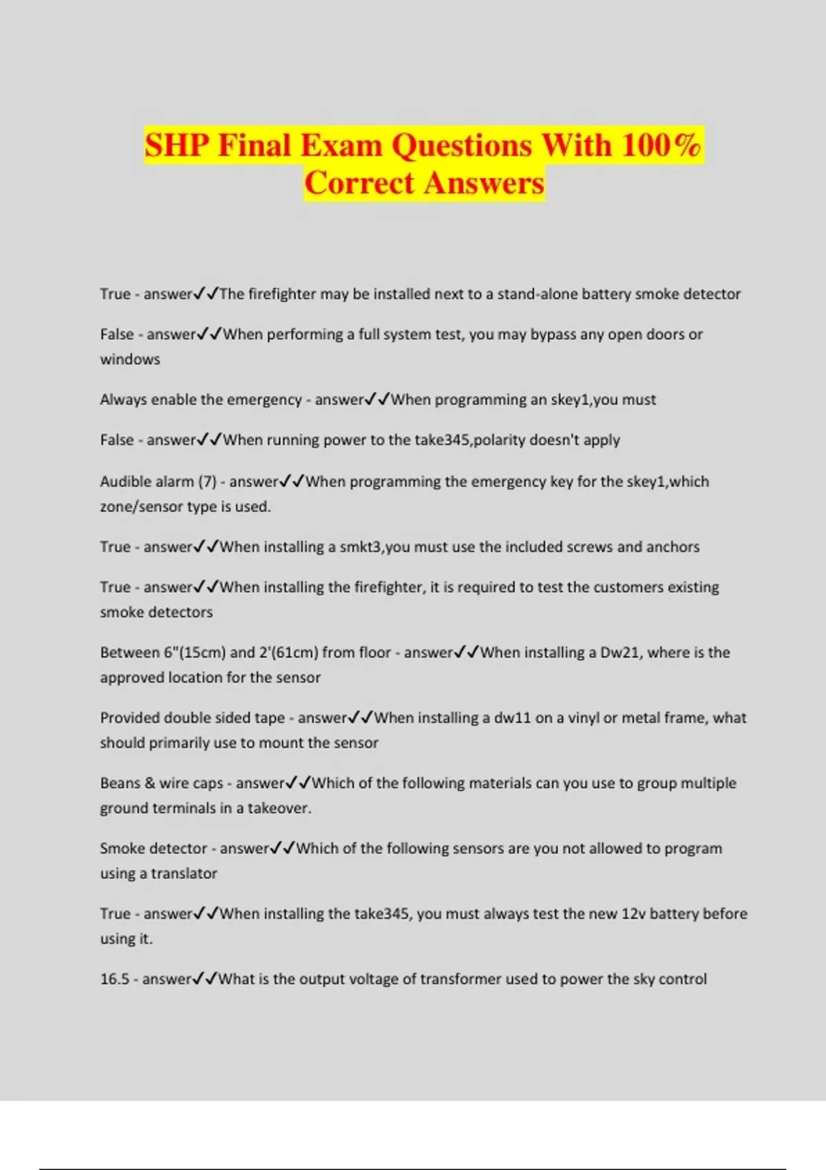 SHP Final Exam Questions With 100% Correct Answers True - answerThe firefighter may be installed next to a stand-alone battery smoke detector False - answerWhen performing a full system test, you may bypass any open doors or windows Always enable the emergency - answerWhen programming an skey1,you must False - answerWhen running power to the take345,polarity doesn't apply Audible alarm (7) - answerWhen programming the emergency key for the skey1,which zone/sensor type is used. True - answerWhen installing a smkt3,you must use the included screws and anchors True - answerWhen installing the firefighter, it is required to test the customers existing smoke detectors Between 6"(15cm) and 2'(61cm) from floor - answerWhen installing a Dw21, where is the approved location for the sensor Provided double sided tape - answerWhen installing a dw11 on a vinyl or metal frame, what should primarily use to mount the sensor Beans & wire caps - answerWhich of the following materials can you use to group multiple ground terminals in a takeover. Smoke detector - answerWhich of the following sensors are you not allowed to program using a translator True - answerWhen installing the take345, you must always test the new 12v battery before using it. 16.5 - answerWhat is the output voltage of transformer used to power the sky control 12" - answerWhat is the minimum distance for placement of a co3 from the corners of the wall False - answerThe smkt3 has 2 function:s