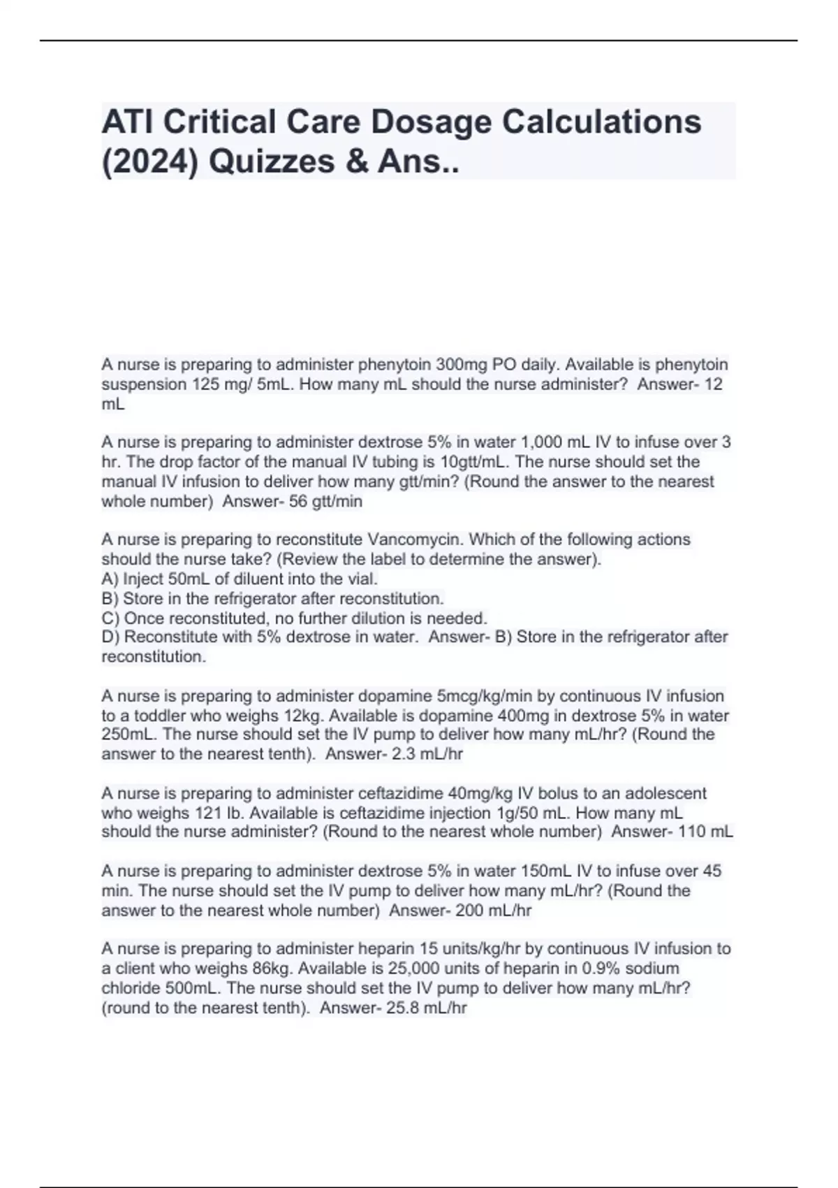 ATI Critical Care Dosage Calculations (2024) Quizzes & Ans..