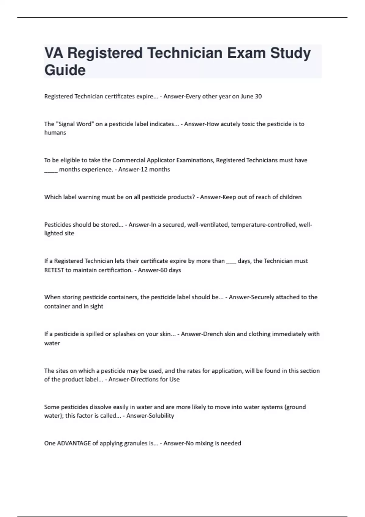 Registered Technician certificates expire... - Answer-Every other year on June 30 The "Signal Word" on a pesticide label indicates... - Answer-How acutely toxic the pesticide is to humans To be eligible to take the Commercial Applicator Examinations, Registered Technicians must have ____ months experience. - Answer-12 months Which label warning must be on all pesticide products? - Answer-Keep out of reach of children Pesticides should be stored... - Answer-In a secured, well-ventilated, temperature-controlled, welllighted site If a Registered Technician lets their certificate expire by more than ___ days, the Technician must RETEST to maintain certification. - Answer-60 days When storing pesticide containers, the pesticide label should be... - Answer-Securely attached to the container and in sight If a pesticide is spilled or splashes on your skin... - Answer-Drench skin and clothing immediately with water The sites on which a pesticide may be used, and the rates for application, will be found in this section of the product label... - Answer-Directions for Use Some pesticides dissolve easily in water and are more likely to move into water systems (ground water); this factor is called... - Answer-Solubility One ADVANTAGE of applying granules is... - Answer-No mixing is neededWhen taking a break from handling or applying pesticides, it is safe to first... - Answer-Wash your hands The best way to determine whether a pesticide is registered for a particular use is to... - Answer-Read the label on the pesticide container When should protective equipment used during pesticide application be cleaned? - Answer-After every use Registered Technicians must attend a Virginia approved recertification course at least every ____ years. - Answer-Two What is NOT a pesticide FORMULATION? - Answer-Growth regulator What IS a pesticide FORMULATION? - Answer-a. Aerosol b. Bait c. Flowable How many times should you rinse and drain empty pesticide containers to prepare them for disposal? - Answer-Three times The annual certification renewal fee for Registered Technicians is... - Answer-$15.00