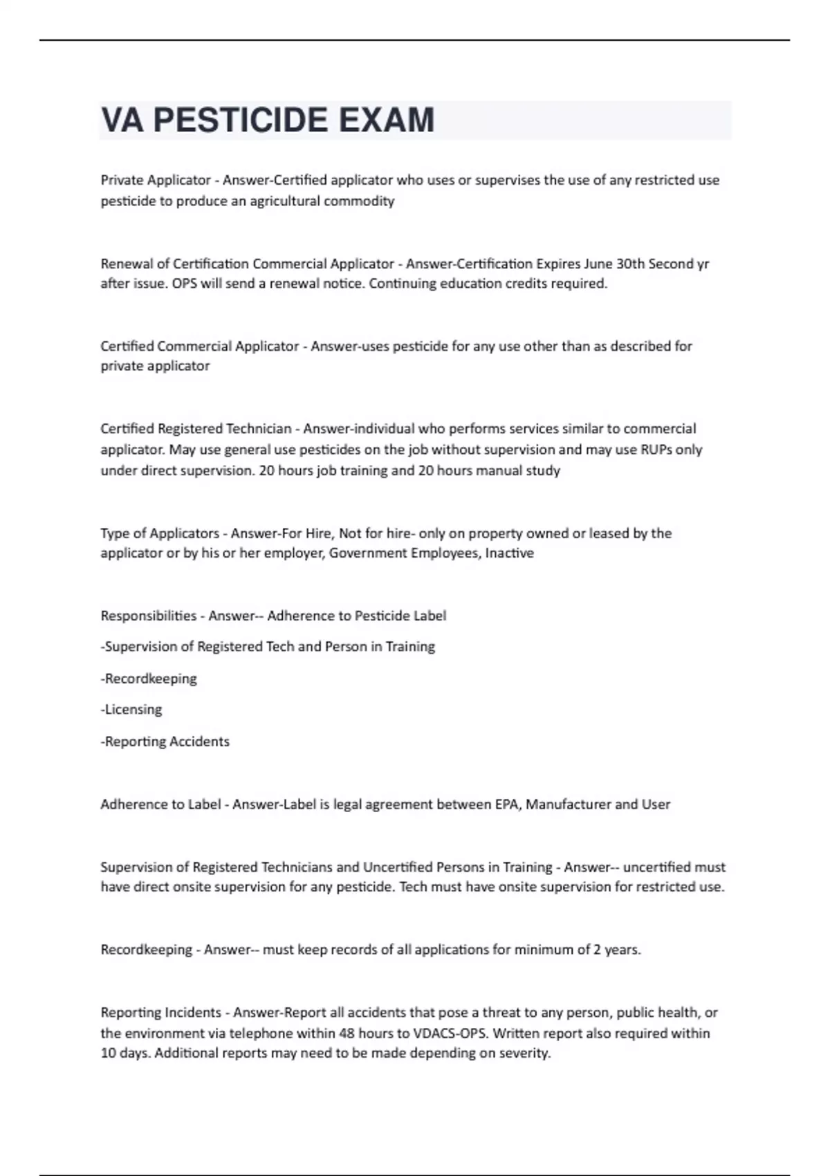 Private Applicator - Answer-Certified applicator who uses or supervises the use of any restricted use pesticide to produce an agricultural commodity Renewal of Certification Commercial Applicator - Answer-Certification Expires June 30th Second yr after issue. OPS will send a renewal notice. Continuing education credits required. Certified Commercial Applicator - Answer-uses pesticide for any use other than as described for private applicator Certified Registered Technician - Answer-individual who performs services similar to commercial applicator. May use general use pesticides on the job without supervision and may use RUPs only under direct supervision. 20 hours job training and 20 hours manual study Type of Applicators - Answer-For Hire, Not for hire- only on property owned or leased by the applicator or by his or her employer, Government Employees, Inactive Responsibilities - Answer-- Adherence to Pesticide Label -Supervision of Registered Tech and Person in Training -Recordkeeping -Licensing -Reporting Accidents Adherence to Label - Answer-Label is legal agreement between EPA, Manufacturer and User Supervision of Registered Technicians and Uncertified Persons in Training - Answer-- uncertified must have direct onsite supervision for any pesticide. Tech must have onsite supervision for restricted use. Recordkeeping - Answer-- must keep records of all applications for minimum of 2 years. Reporting Incidents - Answer-Report all accidents that pose a threat to any person, public health, or the environment via telephone within 48 hours to VDACS-OPS. Written report also required within 10 days. Additional reports may need to be made depending on severity.Pesticide Business License - Answer--$50 annual and a separate license is needed for each location. -$100,000 insurance property damage, $100,000 for personal injury and $300,00 per occurrence - license expires March 31st each year Pesticide Business Responsibilities - Answer--If RUP are sold or distributed a certified commercial applicator must be present at each location during business hours -Commercial Applicator must be employee of business applying or recommending pesticide use. -Sales of all RUP and all applications must be recorded for 2 years -Comply with state regulations Pests - Answer--Competes with humans or desirable plants for food or water -Injures humans, animals, structures, desirable plants, or possessions -Spreads disease -Annoys humans Pest Categories - Answer-Key Pests Occasional Pests Secondary Pests Key pests - Answer-Nearly always present, cause major damage and require regular control Occasional Pests - Answer-Migratory or cyclical and require intermittent control Secondary Pests - Answer-Control only under certain circumstances required Identification - Answer-Required to address a situation including: -Physical Features -Characteristics of damage -Development and Biology -Key, Secondary, or Occasional-Control Goal Basic Pest Groups - Answer--Weeds -Parasites and Diseases -Mollusks -Arthropods -Vertebrates Weeds - Answer--Hardy and Aggressive -Large seed production efficiently spread -Spreading by runners or underground stems -Weed seeds can remain dormant for extended duration -Can tolerate harsh conditions -Can compete for soil moisture, light, and nutrients better than cultivated plants Monocot - Answer--One leaf seed -Parallel Leaf Veins -Fibrous Routs -Grasses and Lillies -Crabgrass, Johnsongrass
