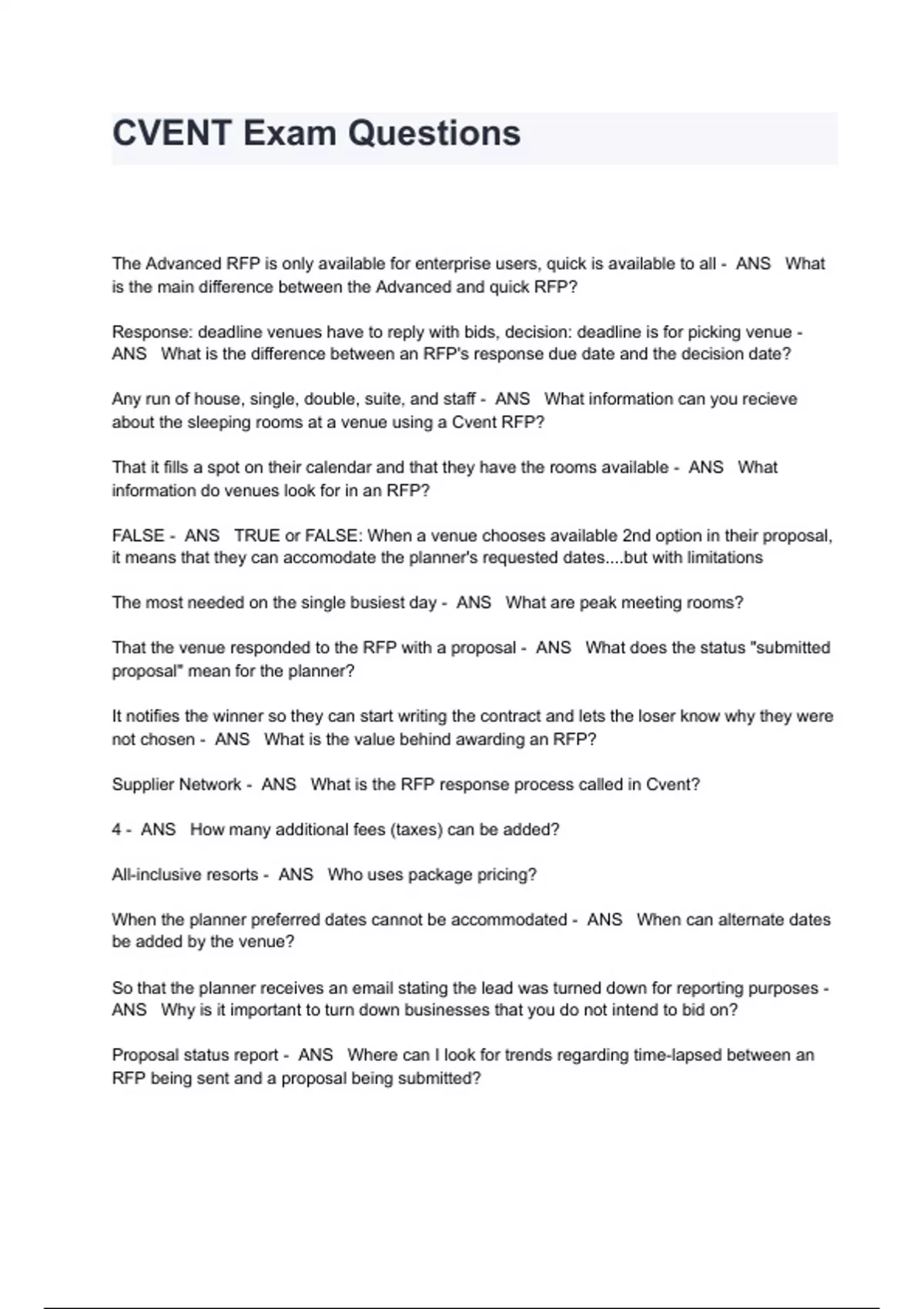 CVENT Exam Questions And Answers The Advanced RFP is only available for enterprise users, quick is available to all - ANS What is the main difference between the Advanced and quick RFP? Response: deadline venues have to reply with bids, decision: deadline is for picking venue - ANS What is the difference between an RFP's response due date and the decision date? Any run of house, single, double, suite, and staff - ANS What information can you recieve about the sleeping rooms at a venue using a Cvent RFP? That it fills a spot on their calendar and that they have the rooms available - ANS What information do venues look for in an RFP? FALSE - ANS TRUE or FALSE: When a venue chooses available 2nd option in their proposal, it means that they can accomodate the planner's requested dates....but with limitations The most needed on the single busiest day - ANS What are peak meeting rooms? That the venue responded to the RFP with a proposal - ANS What does the status "submitted proposal" mean for the planner? It notifies the winner so they can start writing the contract and lets the loser know why they were not chosen - ANS What is the value behind awarding an RFP? Supplier Network - ANS What is the RFP response process called in Cvent? 4 - ANS How many additional fees (taxes) can be added? All-inclusive resorts - ANS Who uses package pricing? When the planner preferred dates cannot be accommodated - ANS When can alternate dates be added by the venue? So that the planner receives an email stating the lead was turned down for reporting purposes - ANS Why is it important to turn down businesses that you do not intend to bid on? Proposal status report - ANS Where can I look for trends regarding time-lapsed between an RFP being sent and a proposal being submitted?