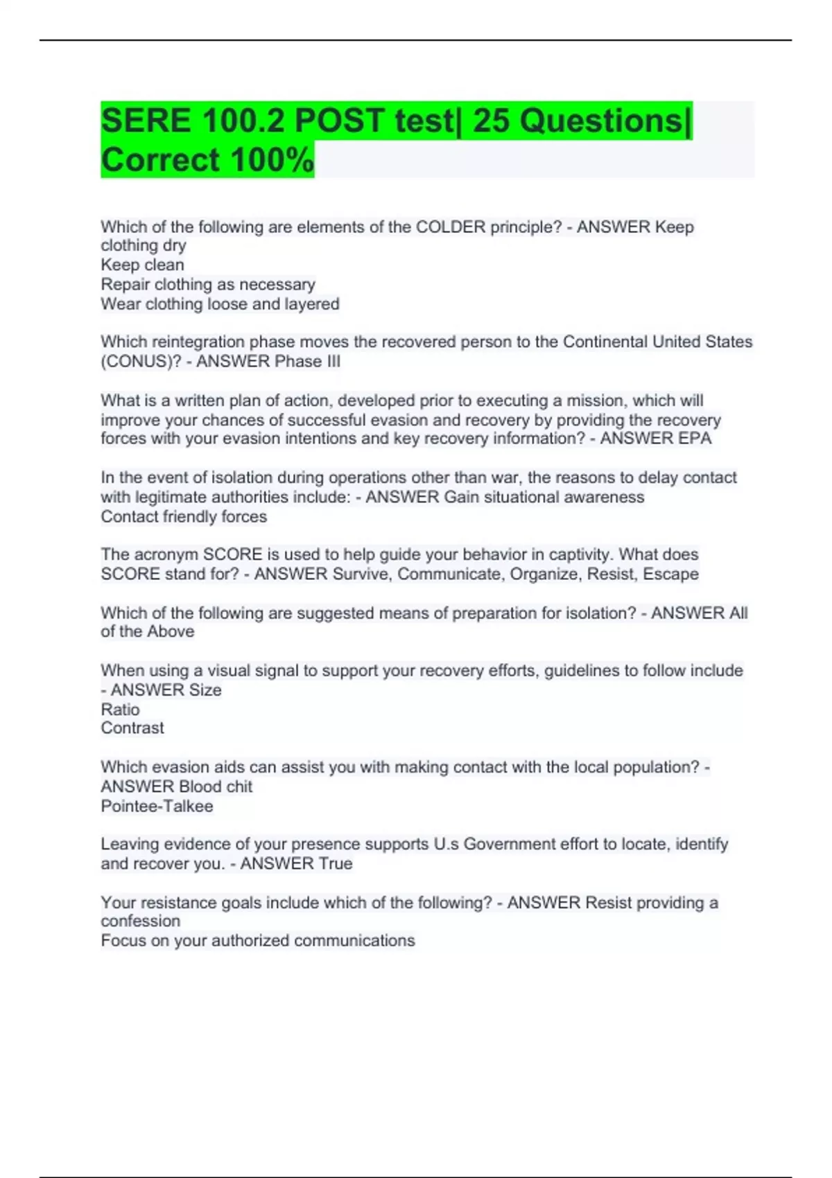 SERE 100.2 POST test| 25 Questions| Correct 100%